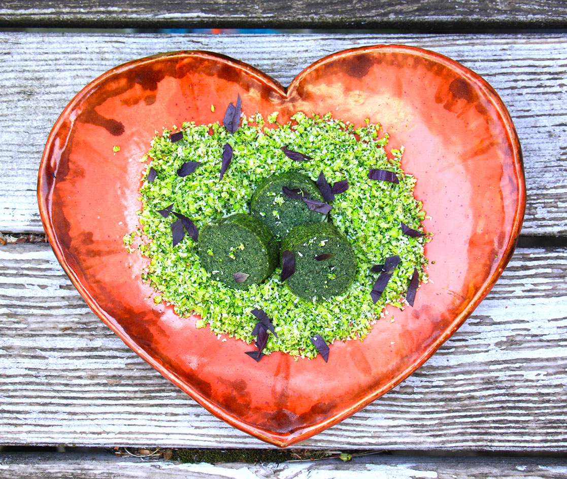 Spinat-Knödel mit Brokkoli-Kokos-Röster für 2 Hungrige oder für 4 als 2. Gang zu einem frischen Salat als Vorspeise: 500g Spinat blanchieren, gut ausdrücken und hacken. 1 große Zwiebeln fein würfeln und in 2 EL Öl glasig braten. Wenn alles Zimmertemperatur hat mit 3 Eigelb und 200g grobem Maniokmehl verkneten, mit Salz, Pfeffer und Knoblauch würzen und die Knödelmasse in Frischhaltefolie zu festen Rollen drehen; diese mit Alufolie umwickeln und 10 Minuten in siedendem Wasser garen. 1 Brokkoli fein raspeln; mit 100g Kokosraspel mischen und in einer Pfanne scharf in Kokosfett anbraten und zum Servieren über die Knödel geben. Wer mag gibt zusätzlich noch geriebenen Ziegenkäse darüber.