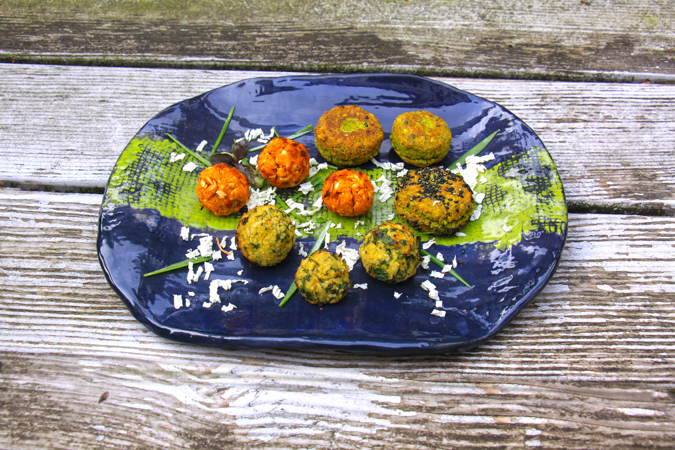 300 g getrocknete halbierte grüne Erbsen mindestens 4 Stunden in reichlich kaltem Wasser einweichen – dann im Sieb abtropfen lassen. 100 g Zwiebeln und 2 Zehen Knoblauch in feine Würfel schneiden. Die Blätter von 8 Stielen Petersilie und 4 Stielen Minze grob hacken. 1 grüne Pfefferschote in Stücke schneiden. Je 1 EL Fenchelsaat, Schwarzkümmel und 4 Kardamomkapseln (andrücken) in einer Pfanne ohne Fett anrösten, abkühlen lassen. Kardamomschalen entfernen und die Gewürze im Mörser fein mahlen. Erbsen, Zwiebeln, Knoblauch, Kräuter, Pfefferschote und Gewürze mit 2 TL Backpulver, 1-2 EL Wasser, 1 EL Salz und Pfeffer in der Küchenmaschine mittelfein pürieren. 2 EL Kichererbsenmehl zugeben und untermixen. Teig abgedeckt 30 Minuten kalt stellen. 80g schwarze Sesamsaat auf Backpapier geben. Aus dem Teig mit feuchten Händen 16 Kugeln formen und in den Sesam drücken. 500g Kokosöl in einem Topf auf erhitzen (wenn man einen Holzlöffel hineinhält muß der Bläschen bilden). Falafel darin portionsweise 8-10 Minuten goldbraun frittieren, auf Küchenpapier abtropfen lassen und mit Joghurt-Knoblauch-Sauce und Blattsalat servieren.