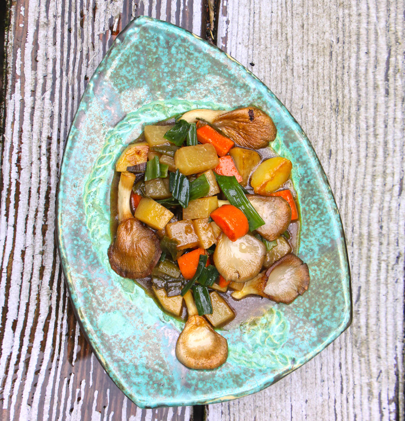 3 Kartoffeln, 6 Möhren, 1 Stange Lauch und 1 mittelgroße Steckrübe ca. 2x2cm groß würfeln. 4 Knoblauchzehen und 5 cm Ingwer fein würfeln. 2 Zwiebeln fein würfeln in einem großen Topf anbraten, das gewürfelte Gemüse sowie Knoblauch und Ingwer dazugeben und mit 1L dunklem Bier (z.B. Guiness) ablöschen – noch 1/2L Wasser aufgiessen und ca. 1/2 Stunde weiterköcheln. Dabei den Deckel offen lassen, damit die Soße etwas reduziert. 800g Kräutersaitlinge oder Austernpilze scharf anbraten und alles zusammen ca. 15 Min. ziehen lassen. 1/2 Bund glatte Patersilie fein hacken und das Stew damit würzen – mit Salz und Cayennepfeffer abschmecken. Reicht für 4 bis 6.