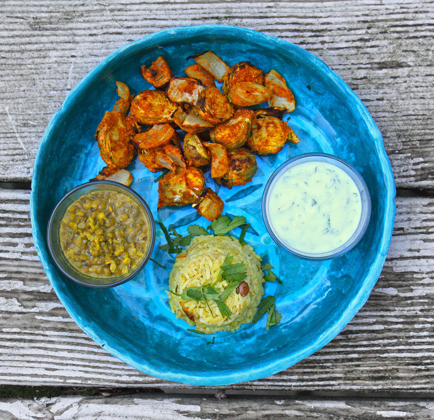 1 Kg Rosenkohl waschen und halbieren oder dritteln; 200g Joghurt* mit dem Saft 1 Limette und 2 EL Tandoori-Gewürz verrühren und mit dem Gemüse mischen; über Nacht oder mind. 3 Stunden marinieren. 1 große Zwiebel in Stücken dazugeben. Den Backofen und ein Backblech auf 220° vorheizen und das Gemüse auf das heiße Blech geben. Nach ca. 15 Minuten ist das Tandoori fertig. Mit Dal, Raita (Joghurt-Minz-Soße) und Chapati (oder Reis) servieren. Diese Zubereitung eignet sich auch sehr gut für Blumenkohl – diesen dafür vor dem Marinieren in Röschen teilen.*Ihr könnt das Gericht auch mit veganer Küchencreme zubereiten.