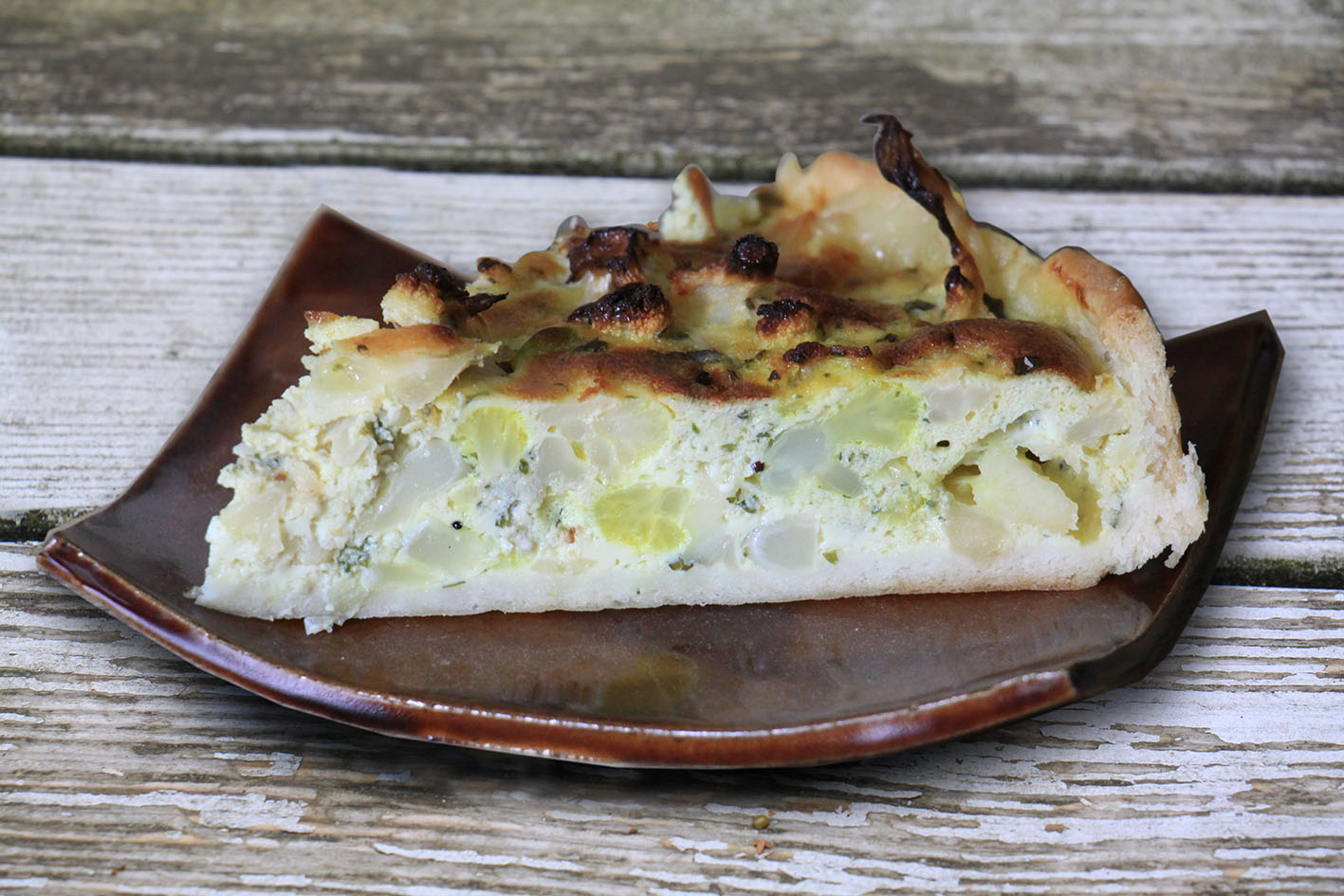 1 Blumenkohl grob gehackt, 4 Eier, 200g Bergkäse (gerieben) und 200g Frischkäse zu einer homogenen Masse rühren, auf den Teig geben und im Backofen bei 180° ca. 40 Minuten backen.