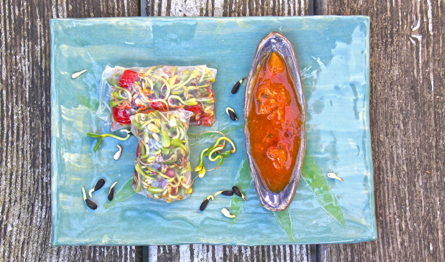 Für 4 Röllchen: 1 Sprossenglas voll Sonnenblumensprossen von den Schalen befreien und mit etwas Erdbeer-Sirup und dem Saft 1/2 Zitrone mischen. 4 Reispapierblätter (zum roh Essen für Sommerrollen) einweichen. Jeweils ca. 2 EL Sprossen auf ein Reispapier legen (nicht zu nah an den Rand) einige Himbeeren oder Erdbeerstücke darauflegen. Von zwei Seiten einschlagen und dann fest aufrollen. Mit dem Dip genießen.