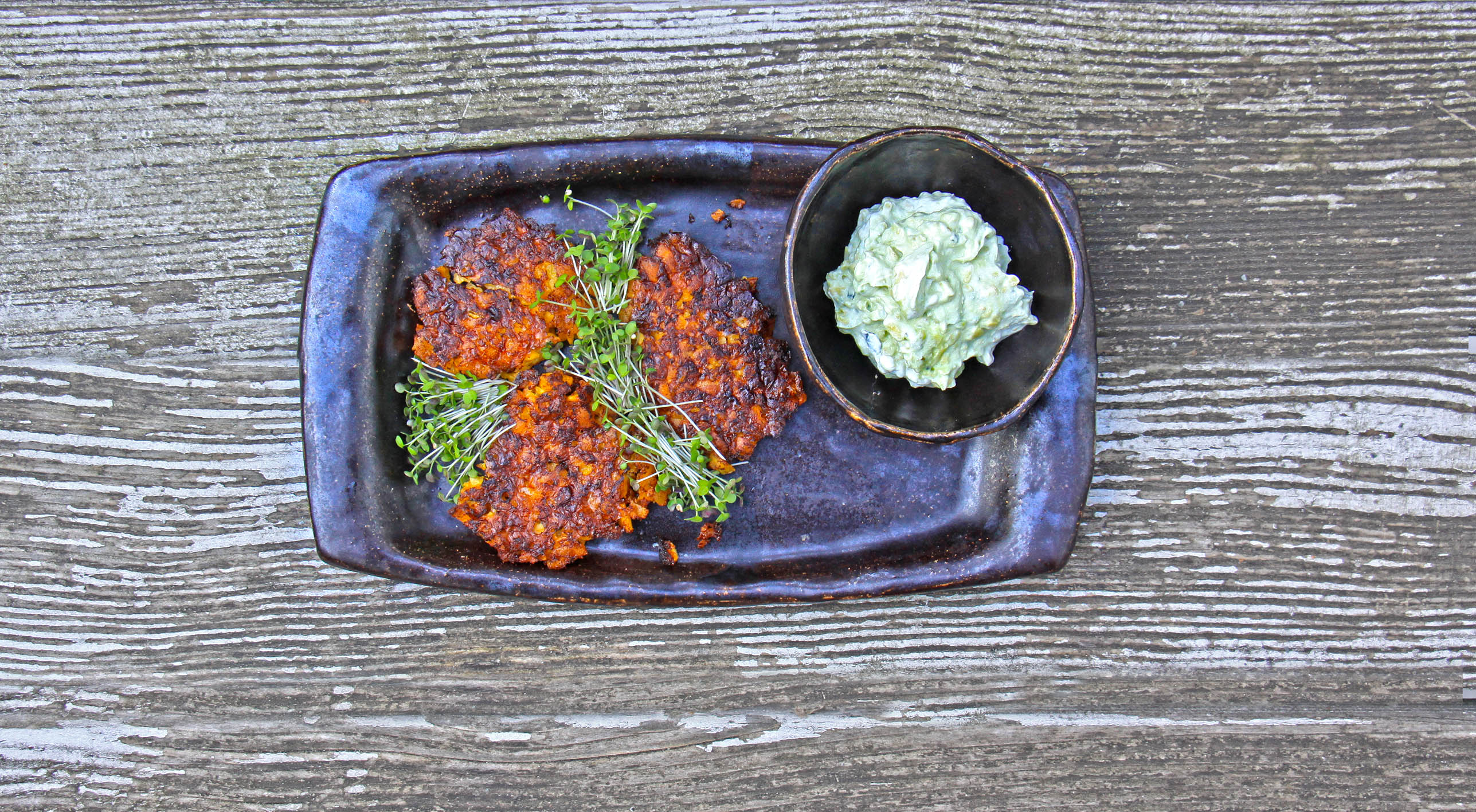 Für 2: 1 Kochbanane schälen und fein reiben. Mit einer Prise Salz und Muskat würzen. Wenn die Bananenraspel zu trocken sind, 1 bis 2EL Wasser zufügen. Für den Quark: 1 Avocado und 200g Magerquark (wenn es vegan bleiben soll – Seidentofu statt Quark nehmen) zusammen pürieren. Mit Salz und Pfeffer abschmecken. In einer Pfanne Öl erhitzen und mit einem großen Löffel die Masse in (3 Portionen pro Durchgang) die Pfanne geben (warmhalten, bis alle fertig sind). 1 kleines Beet Sprossen (ca. 10x15cm) ernten und die Reibekuchen mit dem Quark und den Sprossen servieren.