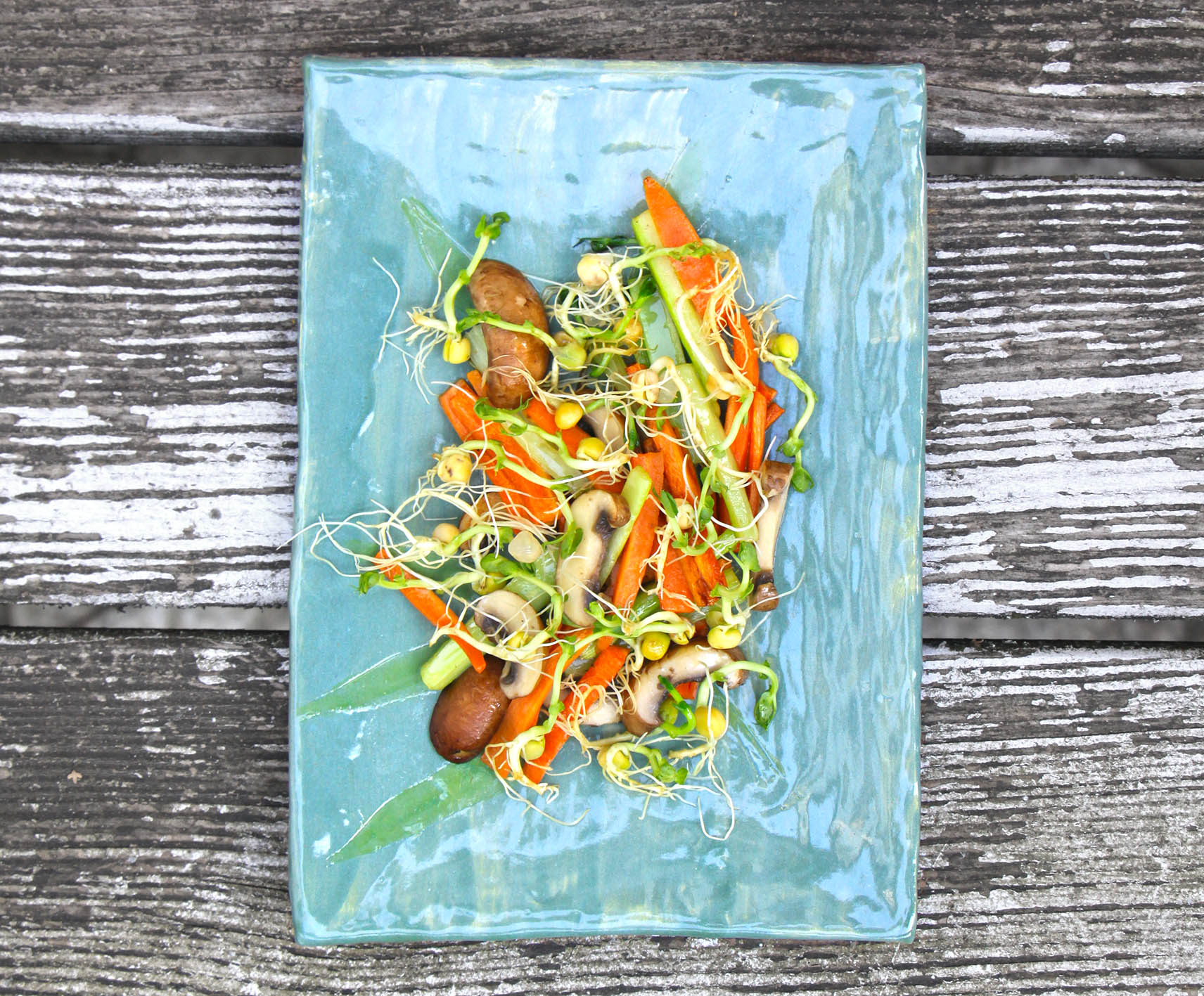 für 2: 2 Möhren, 3 Stangen Staudensellerie und 8 braune Champignons in Streifen schneiden. 10x20cm Erbsen-Microgreens waschen und trocken schütteln. Im Wok 2EL Erdnussöl erhitzen und das Gemüse kurz anbraten. Mit Sojasoße, Zitronensaft und Salz abschmecken. Schmeckt als leichtes Mittag- oder Abendessen einfach so – für den größeren Hunger passt Reis dazu.