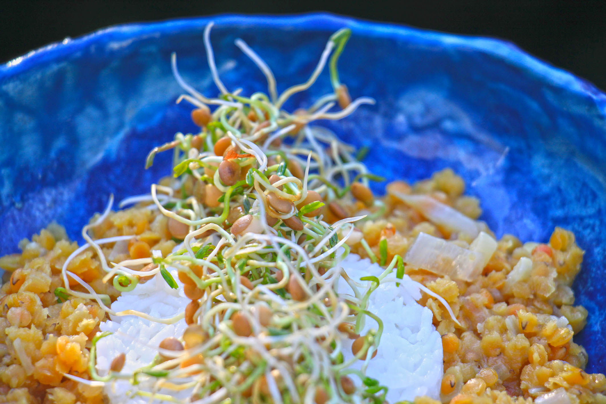 für 2: 1 kleine, milde Zwiebel (Schalotte), 1 Knoblauchzehen und 1 daumengroßes Stück Ingwer schälen, fein würfeln und in 1EL Kokosöl in einem Topf anschwitzen. 2 Tassen rote Linsen dazu geben und mit 1/2 L Gemüsebrühe ablöschen. Für ca. 10–15 Minuten köcheln lassen, wenn es zu trocken erscheint nochmal etwas Brühe (oder Wasser zugeben) – es soll nicht so flüssig wie eine Suppe sein, aber auch nicht „bröselig“. In der Zwischenzeit auch 1 Tasse weißen Basmati-Reis kochen sowie 2 Tassen Linsen-Microgreens ernten. Die gekochten Linsen mit Salz, Koriander und Kurkuma abschmecken und mit Reis und Microgreens servieren.
