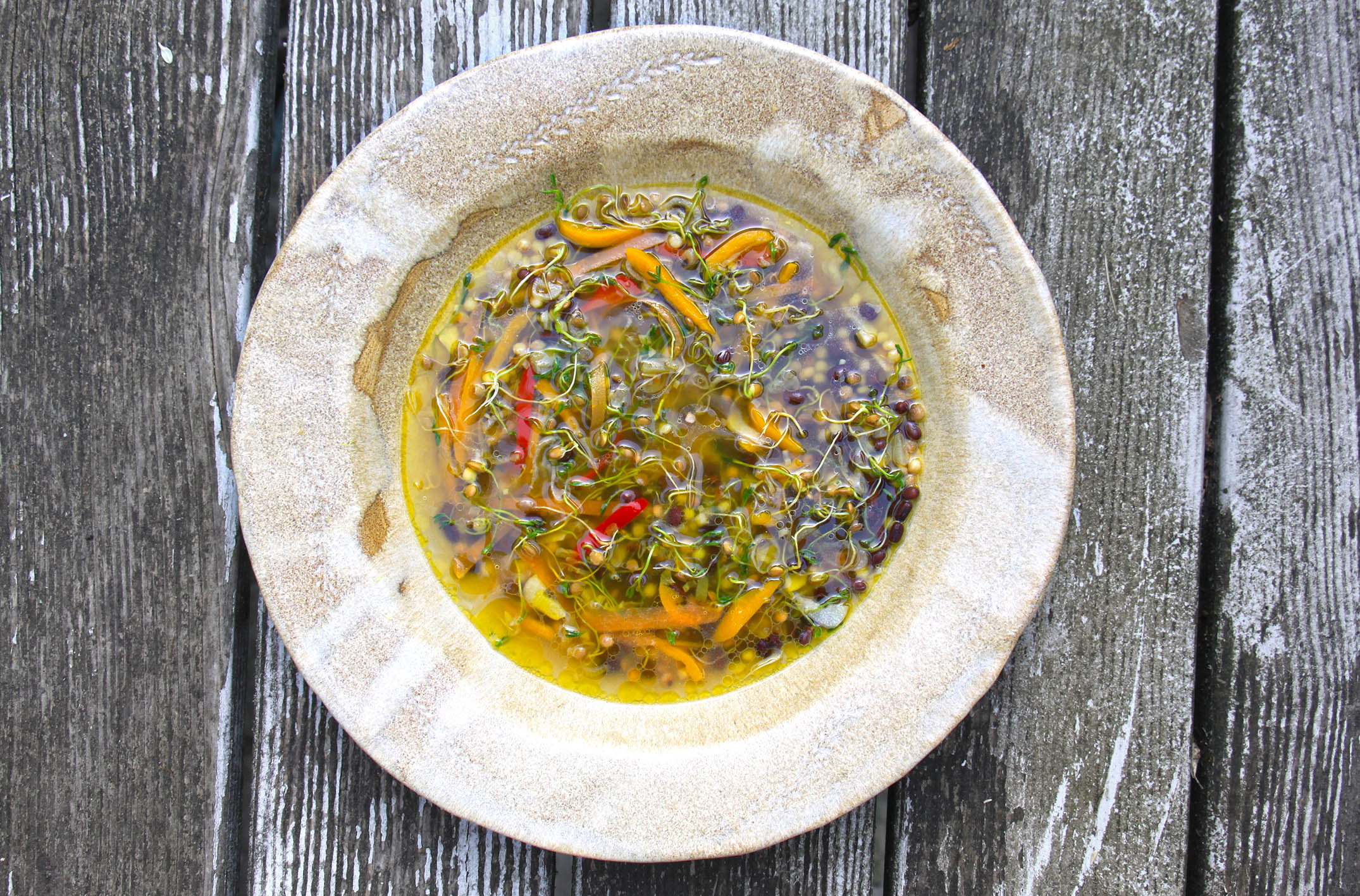 für 2: Am Vorabend 1 Tasse Adzukibohnen einweichen. Am nächsten Tag in frischem Wasser 20 Minuten kochen. 750ml hausgemachte Gemüsebrühe bereitstellen. 1Tasse Linsen-Microgreens ernten. 1 Möhre und 2 Mini-Paprika in feine Streifen schneiden. 1 kleine Zwiebel und 1 Knoblauchzehe in feine Scheiben schneiden. 1 Tasse „Fregola tostata“ (kleine, kugelförmige Nudelspezialität) bereit stellen. In einem Topf 2EL Olivenöl erhitzen, Zwiebel und Knoblauch darin anschwitzen. Dann die Hälfte der Brühe aufgießen und zum Kochen bringen. Die Fregola hineingeben und 5 Minuten kochen lassen. Dann die restliche Brühe, sowie das geschnittene Gemüse und die Bohnen dazu geben. Noch einmal zum köcheln bringen und dann 15 Minuten leicht sieden lassen. Ganz zum Schluss die Microgreens in die Suppe geben.