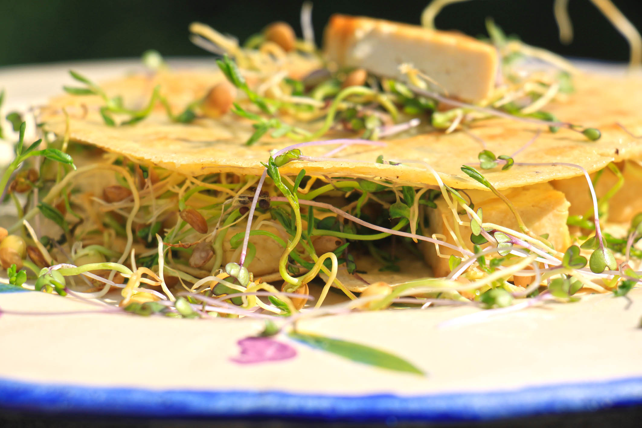 1 Portion: 2 Mais-Tortillas (ø ca. 18cm) bereit legen. 1 kleines Beet Sprossen und 1 Tasse Microgreens (z.B. Linse, Erbse) ernten. 1/2 Avocado mit einer Gabel zerdrücken oder pürieren, mit Salz, Chili und Limette würzen. Die Tortilla-Fladen damit bestreichen. 1/2 Feto (veganes, fermentiertes Tofuprodukt) oder 100g Feta in Scheiben schneiden. In einer passenden Pfanne 1TL Öl erhitzen und den ersten Fladen hineinlegen, die Microgreens und den „Käse“ darauf geben, dann die Sprossen und mit dem 2. Fladen (Avocado nach unten) abdecken. Etwas andrücken. Nach ca. 5 Minuten mithilfe von 2 Tellern (oder einer 2. Pfanne) wenden. Wenn ihr einen Sandwich-Toaster besitzt, geht das dort erheblich einfacher, da nichts gewendet werden muß!