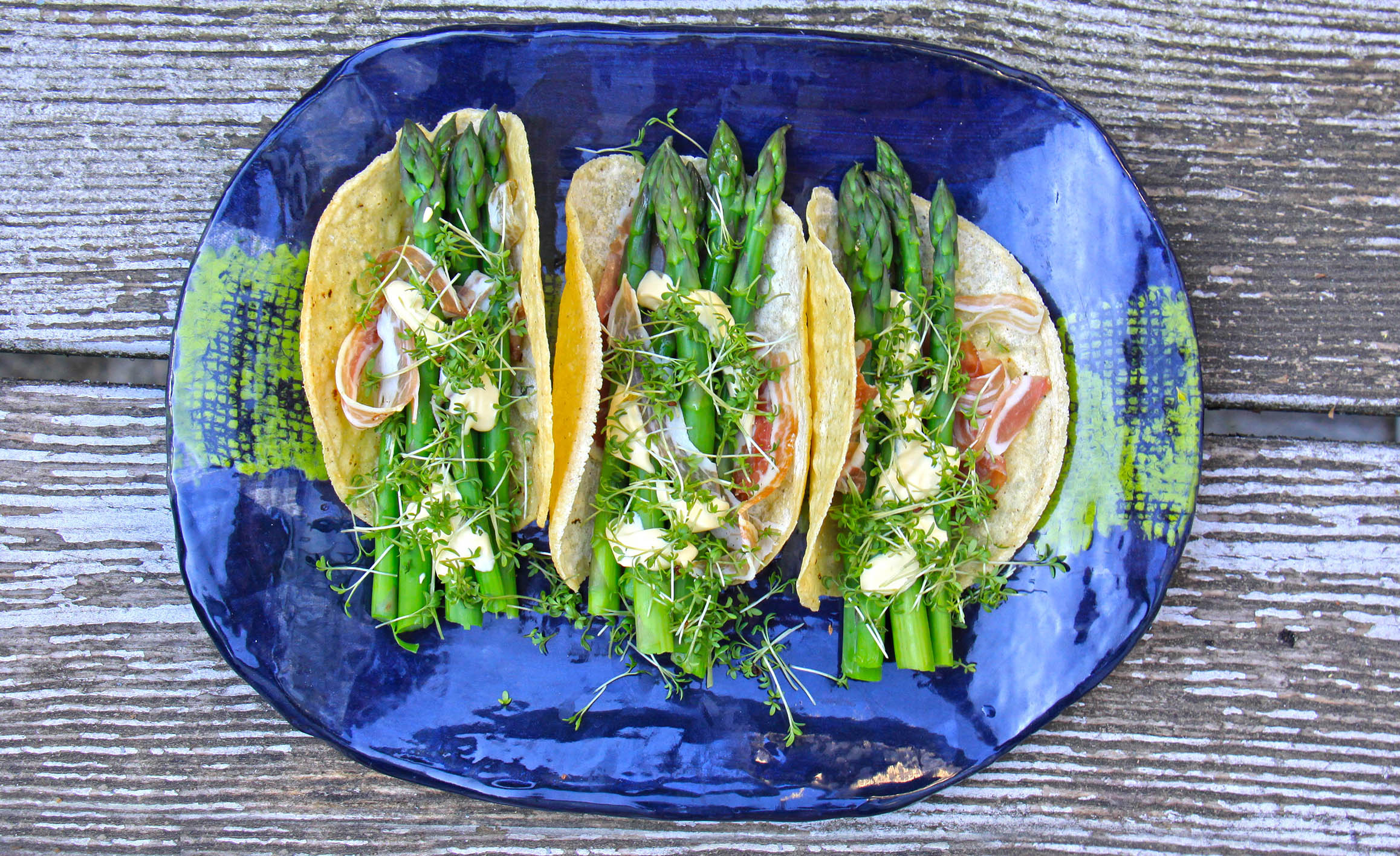 für 6 Tacos: 6 kleine Mais-Tortillas in einer Pfanne in etwas Olivenöl kurz braten und sofort in eine Schale legen um sie zu Schalen zu formen (oder fertige Taco-Shells nehmen). Für die Käsesauce: 25g Butter schmelzen und 25g Mehl dazugeben, etwas anschwitzen (nicht braun werden lassen) und mit 500ml Milch ablöschen. Für 15 Minuten gut rühren und dabei leicht köcheln. Dann 100g geriebenen Käse (gut schmelzend z.B. Emmentaler) hinein rühren bis der Käse komplett geschmolzen ist. 1 Beet Kresse ernten (ca. 7×10 cm). Ca. 750g grünen Spargel (24 Stangen) auf ca. 15cm Länge kürzen (evtl. Reste für eine Suppe aufheben) und in Salzwasser ca. 5 Minuten kochen. Die Taco-Shells mit je 1 Scheibe Coppa oder Pancetta (durchwachsener Rohschinken) belegen. Dann jeweils 4 Stangen Spargel darauf legen mit der Käse-Soße bedecken, etwas Kresse darüber streuen und sich schmecken lassen.