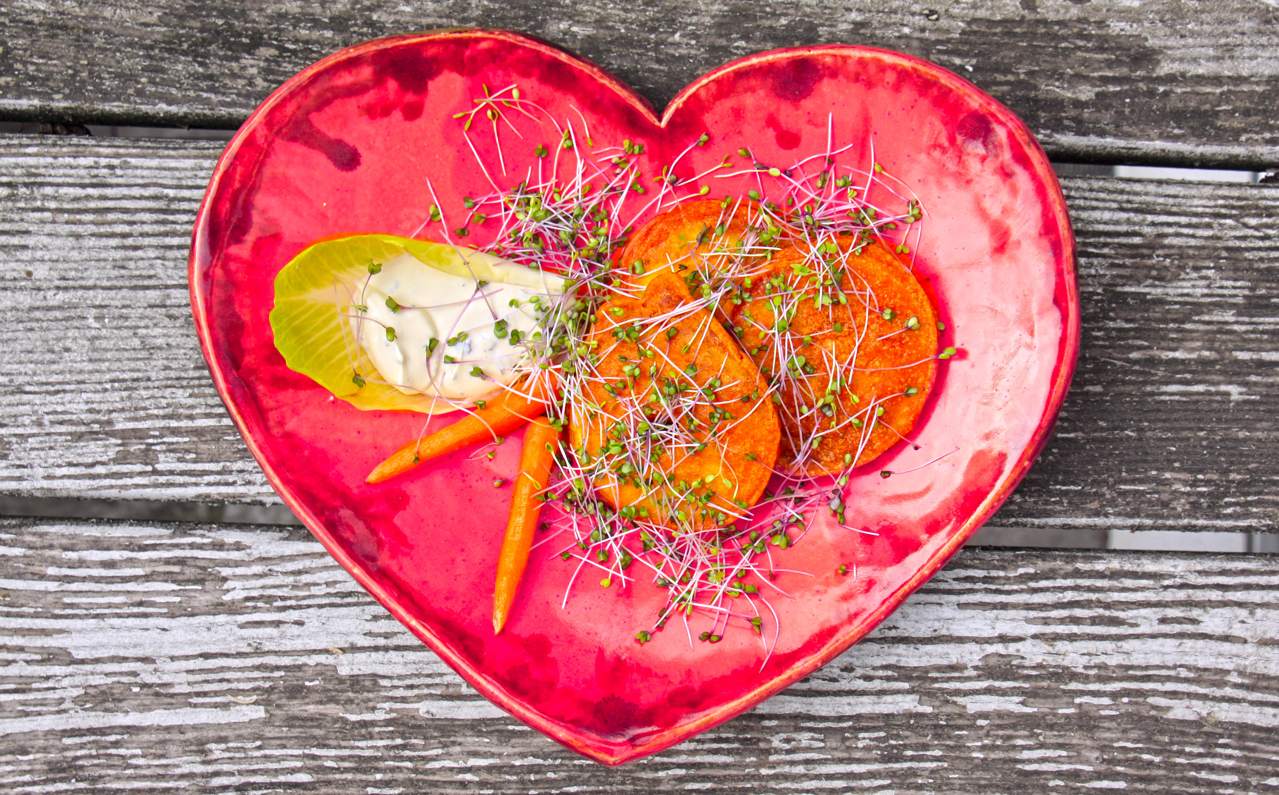 Für den Tempurateig: 1 Ei, 1/2TL Salz, 70g Maniokmehl (Ruut), 30g Pfeilwurzelmehl (oder andere Stärke), 1/2 Päckchen Backpulver, 100ml sehr kaltes Wasser (erst nach und nach zugeben) zu einem glatten Teig verrühren (er sollte nur sehr langsam von einer Gabel fließen). Die Apfelringe durch den Teig ziehen und in Erdnussöl kross ausbacken. Zum Chicoree auf die Teller geben, reichlich Rotkohlsprossen darauf streuen. Dazu passen noch kleine Möhrchen – die in Butter, etwas braunem Zucker karamelisiert und mit einer Prise Vanille aromatisiert wurden.