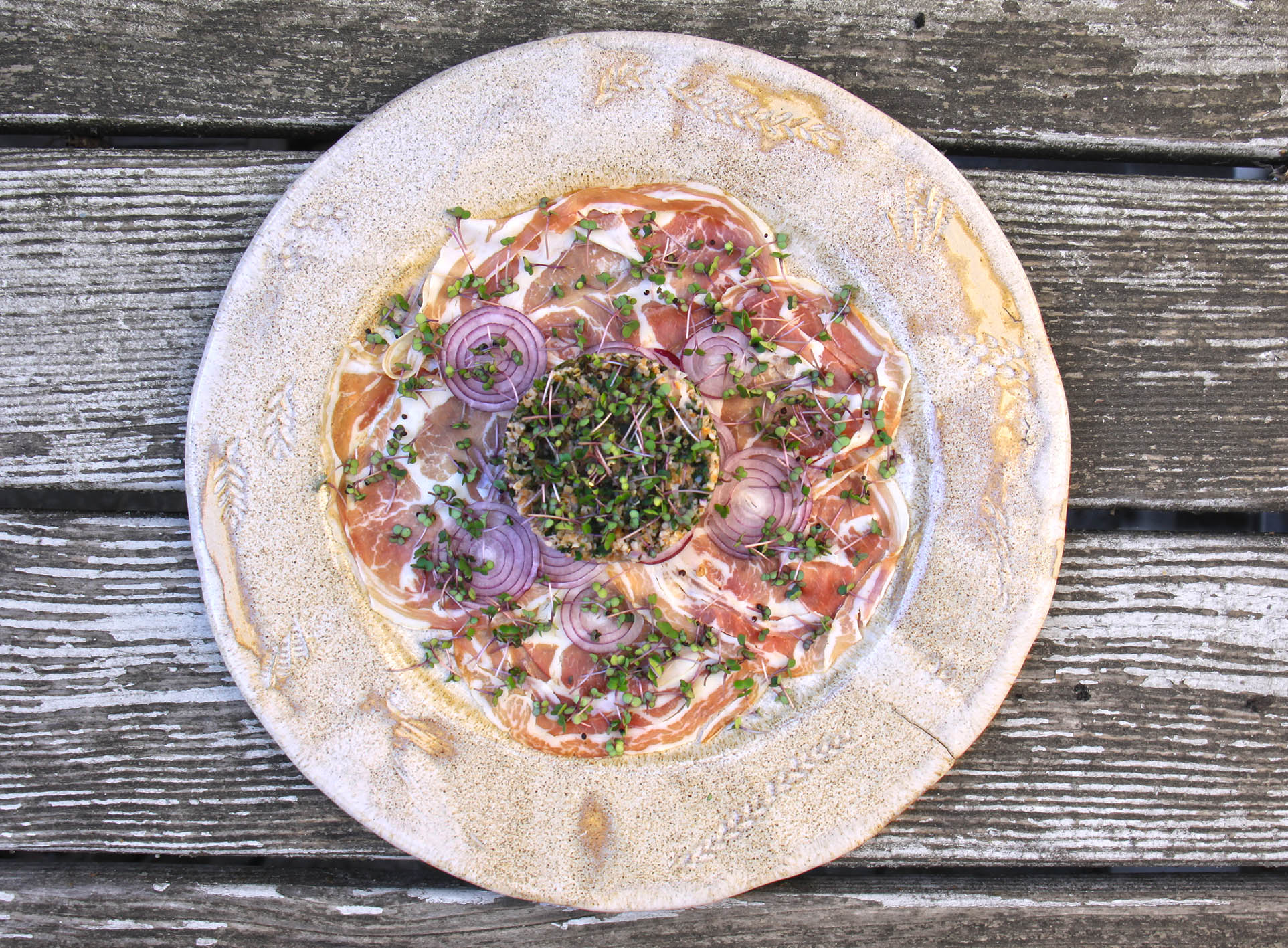 für 2: 80g Dinkelgrütze (Bulgur) in der doppelten Menge Wasser aufkochen, anschließend ca. 15 Minuten quellen lassen und mit Salz abschmecken. 1 großes Beet (10x15cm) Grünkohl-Sprossen ernten, ca 2–4 EL zur Seite legen und den Rest der Sprossen mit dem Bulgur mischen. 1 rote Zwiebel in sehr feine Ringe schneiden. Auf 2 Teller je 5 dünne Scheiben Pancetta legen, die Zwiebelringe darauf verteilen und jeweils in die Mitte mit einem Anrichte-Ring den Bulgur setzen – dann mit den restlichen Grünkohl-Sprossen bestreuen.