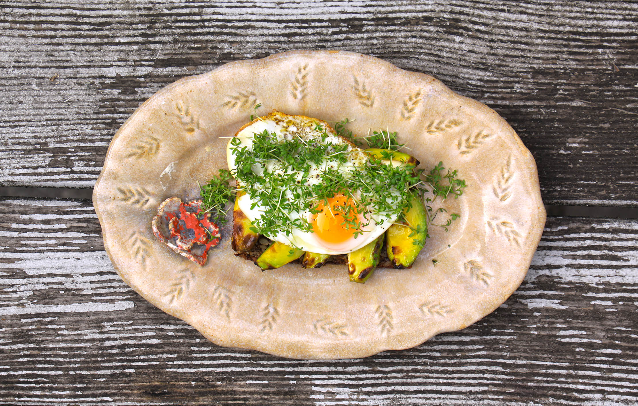 1 Portion: 2–3 Scheiben vom Buchweizen-Keimlingsbrot abschneiden (es geht nicht sehr stark auf und die Scheiben sind daher nicht so groß). 1 Avocado (nicht zu reif) in Scheiben (ca. 1 cm dick) schneiden und in einer Grillpfanne oder im Backofen kurz grillen, bis sie etwas Farbe hat. 1 Spiegelei braten. 1 Beet zarte Sprossen ernten (z.B. Möhre, Senf, Radieschen oder Brokkoli). Die Brotscheiben toasten, nebeneinander auf den Teller legen, die gegrillten Avocado-Scheiben und das Spiegelei darauf legen und als Topping die Sprossen obendrüber.