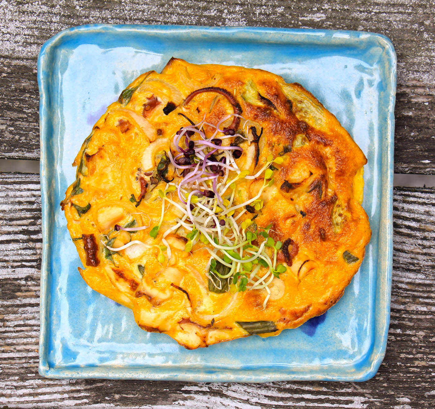 Pro Person: Den Ofen auf 200° vorheizen. 3 Eier in eine Schüssel schlagen, verquirlen und mit Salz und Pfeffer würzen. 1/4 süsse Zwiebel in Ringe schneiden. 1–2 Pulpo-Arme (je nach Größe) und 1 Pellkartoffel ebenfalls in mundgerechte Stücke schneiden. Alles mit den Eiern mischen. Eine kleine (Ø ca. 22 cm) ofenfeste Form mit Backpapier auslegen, die Eier-Fisch-Masse hineingeben und ca. 20 Minuten backen.Mit frisch geernteten Sprossen (z. B. Radieschen, Rettich oder Kresse) vernaschen.