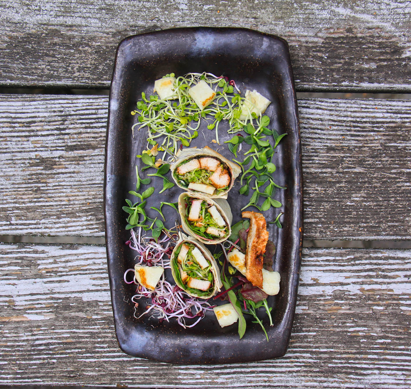 Für 2: Eine Bio-Hähnchenbrust teilen und mit dem Saft 1/2 Zitrone und 1/2 TL Salz rundherum würzen. 100g Joghurt mit 1 EL Tandoori-Paste gründlich verrühren. Die Hühnerbrust-Teile darin für mindestens 6 Stunden einlegen. Für den hausgemachten Paneer (Frischkäse): 1 Liter Milch aufkochen, Saft von 1,5 Zitronen dazugeben bis die Milch gerinnt – durch ein Stofftuch die Molke abseien – die Käsekrümel mindestens 2 Stunden pressen – in Würfel schneiden. Den Backofen mit einem Blech auf die höchste verfügbare Temperatur vorheizen (bei mir sind das 250°). 200g Babyspinat und/oder Baby Mangold waschen und trocken tupfen. Frische Rettich- und Radieschen-Sprossen ernten. Für das Pfannenbrot: 100 g Weizenmehl (550), 1/2 TL Salz und 70 ml lauwarmes Wasser vermischen und mit den Händen oder mit dem Knethaken des Mixers gut verkneten. Ca. 10 Minuten lang kräftig kneten bis der Teig weich und geschmeidig ist, dann zu einer Kugel formen. Teig mit einem Küchentuch abdecken und 15 Minuten ruhen lassen. Nach 15 Minuten den Teig in 4 Stücke teilen, zu Kugeln formen und abdecken, damit der Teig nicht austrocknet. Jetzt das Huhn auf das heisse Blech legen und ca. 10–15 Minuten garen, dann in Streifen schneiden. Eine Arbeitsfläche bemehlen, und die Kugeln mit einem Nudelholz dünn ausrollen. In einer beschichteten Pfanne bei mittlere Hitze von jeder Seite für ca. 30 – 40 Sekunden backen. Die Brote mit dem Blattgemüse belegen, jeweils ein Viertel des Hühnerfleischs darauf verteilen, dann die Sprossen und zum Schluss einige Käsewürfel geben. Aufrollen, teilen und vernaschen.