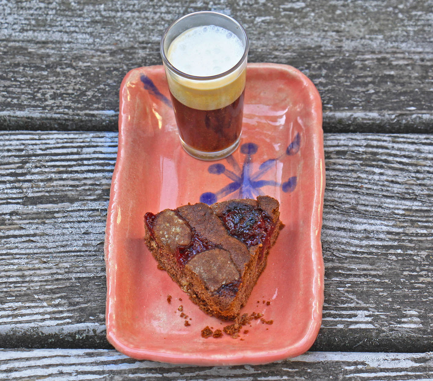 Für 1 normale Springform: 150g zimmerwarme Butter und 100g Puderzucker mit den Knethaken verkneten. 250g Mehl, 100g gemahlene Nüsse und 50g Kakao mit 10g Backpulver (das ist etwas mehr als 1/2 Päckchen) sowie einer Prise Salz und 1/2 TL gemahlener Tonka-Bohne mischen und mit 1 Ei zur Butter-Zucker-Mischung geben. Dann alles verkneten und den Teig kalt stellen. Nach ca. 1 Stunde 3/4 des Teiges (ca. 1,5 cm dick) ausrollen und damit den Boden der Springform bedecken. Das restliche Viertel zu Rollen formen. 300g Kornelkirsch-Marmelade (oder Rote Johannisbeere – Hauptsache: schön sauer) auf den Boden streichen und aus den Rollen ein Gitter oben auf die Marmelade legen. Bei 180° ca. 40 Minuten backen.