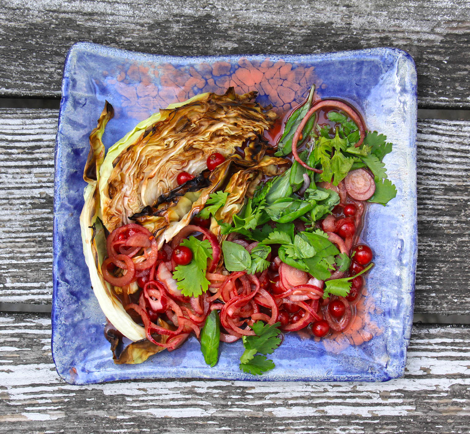 Für 2 als Hauptgericht oder für 4 als Beilage: 1 rote Zwiebel in sehr feine halbe Ringe schneiden oder hobeln und mit 1/2 TL Salz, 1 EL Honig und 2 EL Beeren-Essig in eine Schüssel geben. 1 kleinen Spitzkohl vierteln und auf dem heissen Grill oder im Backofen mit Grillfunktion ca. 10 Minuten bräunen. 50g Johannisbeeren und 1 EL Schwarzkümmelöl zu den Zwiebeln geben, die Beeren teilweise leicht zerdrücken. Je 2 EL Korianderblättchen und Basilikum (noch besser rote Basilikum-Microgreens) vorbereiten. Den Kohl auf Tellern verteilen und mit dem Zwiebel-Beeren-Dressing bedecken. Dann die frischen Kräuter darüber streuen. Schmeckt pur mit Roggenbrot oder als Beilage z. B. zu gegrilltem Fisch.