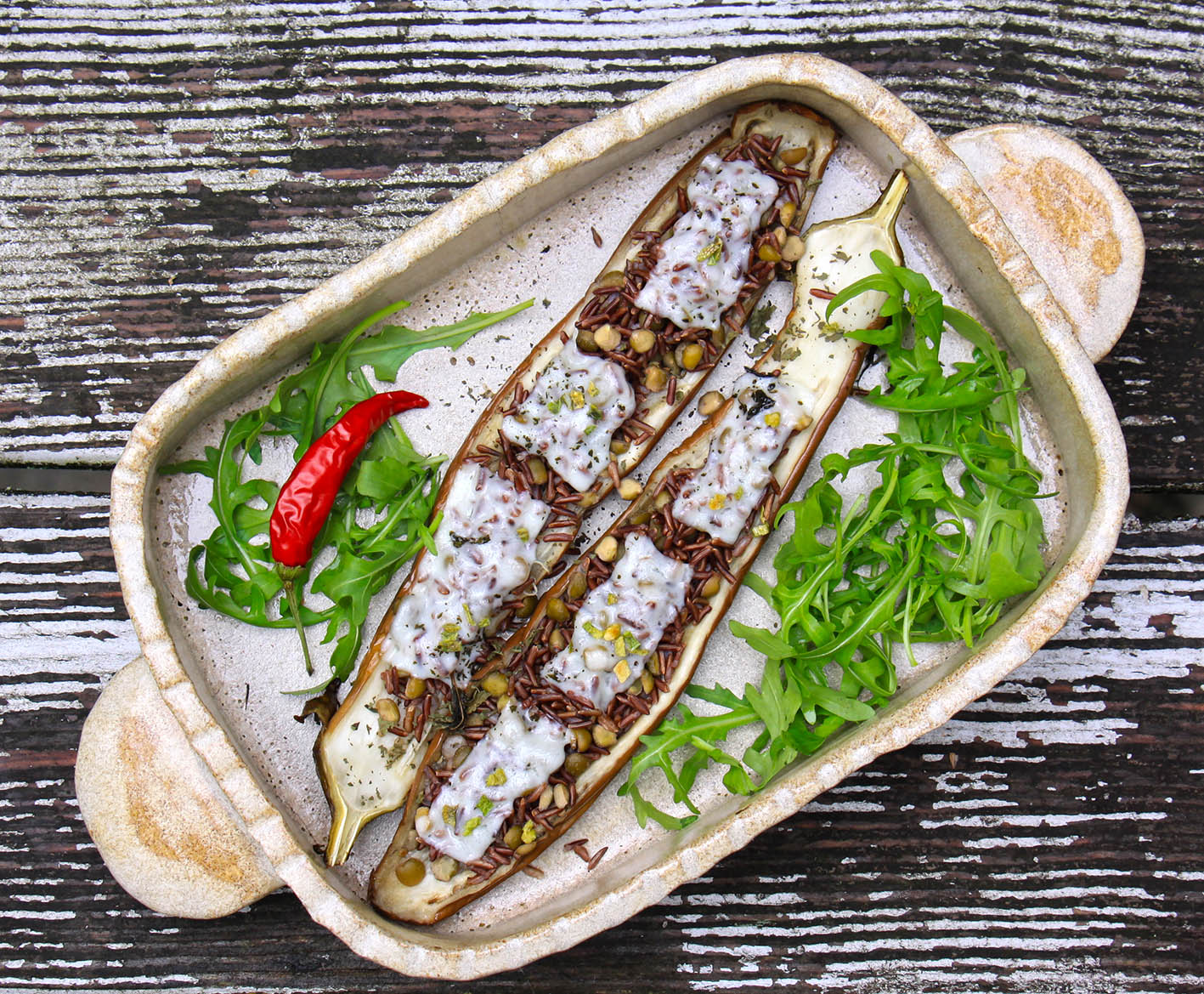 Für 2 als leichtes Hauptgericht oder in Kombination mit anderen kleinen Gerichten. 2 längliche dünne Auberginen halbieren und mit der Schnittfläche auf ein Backblech legen – diese vorher mit Backpapier auslegen und mit etwas Salz bestreuen. Die Hautseite der Auberginen mit einer Gabel ein paar mal einstechen. Nun die Auberginenhälften ca. 10–15 Minuten bei 160° vorgaren. In der Zwischenzeit 1 Tasse roten Reis kochen. Ca.10 frische Erbsen auspulen (oder 1/2 Tasse TK Erbsen auftauen) und 1 Zwiebel fein würfeln. Die Zwiebelwürfel in etwas ca, 1 EL Öl anschwitzen, die Erbsen und den fertig gegarten Reis dazugeben. Mit je 1/4 TL Cumin, Zimt, Paprika und Cayenne-Pfeffer sowie 2 EL Tomatenmark würzen. Die Auberginen in der Mitte etwas aushöhlen und mit dem Reis füllen. In eine ofenfeste Form legen und mit etwas geriebenem Ziegenkäse bestreuen. Für 15 Minuten im noch heissen Ofen überbacken. Veganer nehmen zum überbacken etwas geriebeen (oder fein gehackten “Tofu wie Feta“).