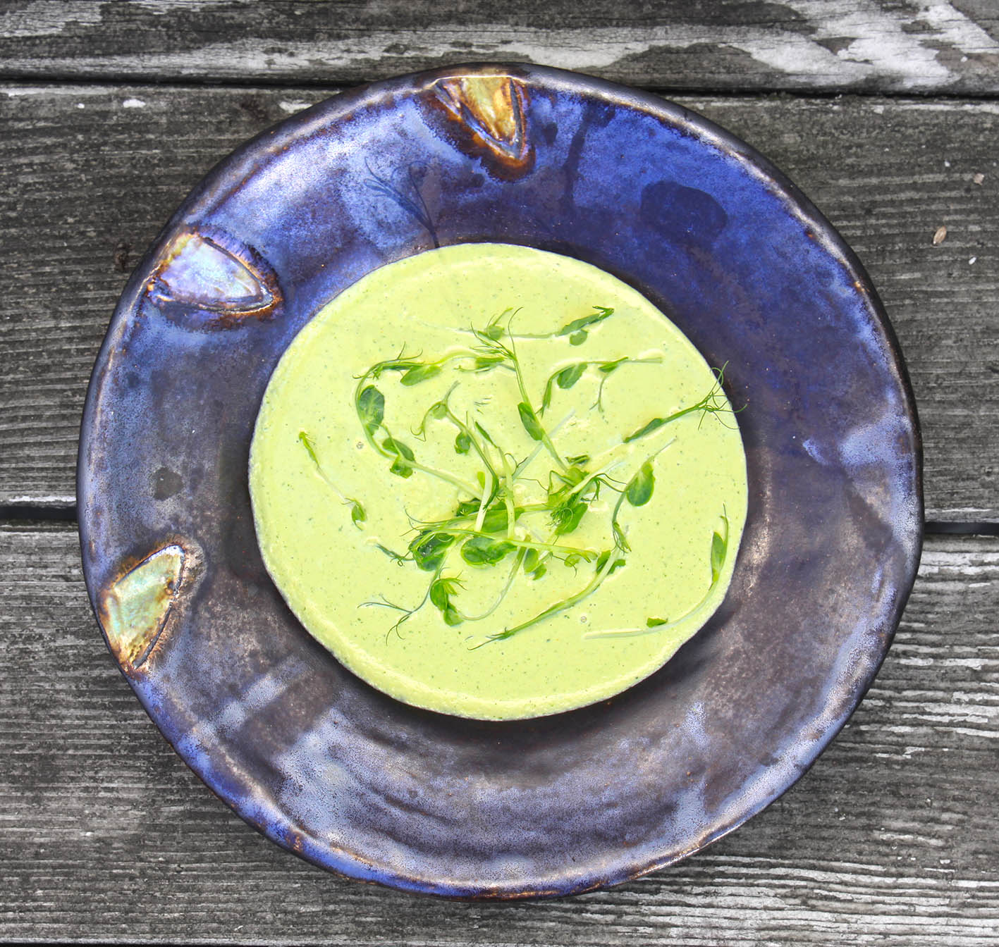 Für 2: 200g küchenfertige Kichererbsen (eingeweicht und gekocht oder aus dem Glas) mit 1 EL Sesampaste (Tahini), 1 Knoblauchzehe, ca. 1 cm frischem Ingwer und 200 ml Kokosmilch aufkochen. 1/2 Bund Koriander (ruhig mit Stielen) hacken und dazugeben (nicht mehr kochen). Nun alles mit dem Zauberstab fein pürieren, mit dem Saft 1 Limette, 1 TL grünem Curry (z. B. „Hara“ von Altes Gewürzamt) sowie 1/2 TL Salz abschmecken. Wer die Suppe lieber etwas flüssiger mag, gibt noch heiße Gemüsebrühe hinzu. Die Suppe mit reichlich Erbsen-Microgreens servieren.