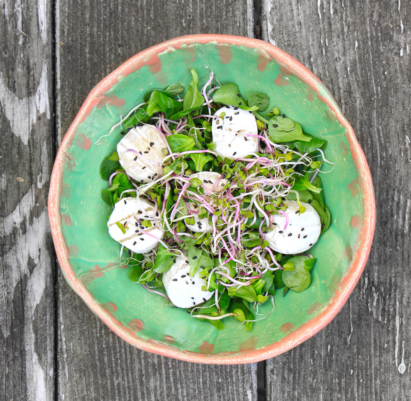 Für 2: 150g Feldsalat putzen und mit 150g Roten Rettich-Sprossen mischen. Aus je 2 EL Holunder-Balsamico und Walnuss-Öl mit 1 TL Senf und etwas Salz ein Dressing zubereiten. Den Salat und 200g kleine Harzer Rollen auf 2 Teller verteilen, das Dressing und etwas Schwarzkümmel darüber geben und vernaschen.