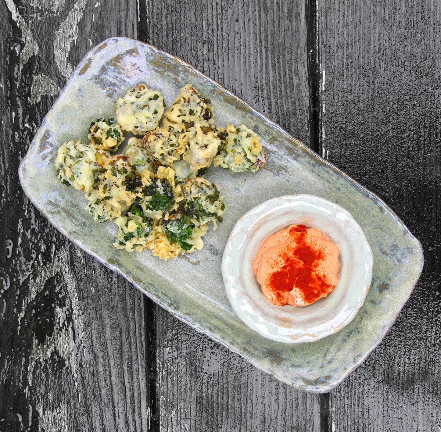 Für 2 Portionen: für den Käse-Dip aus 220g Frischkäse, 1 EL Tomatenmark, 1 TL geräuchertem Paprikapulver und 50g Kochkäse (alternativ Schmelzkäse) einen cremigen Dip zubereiten. 200g Flower Sprouts waschen und ggf. putzen. Öl zum Frittieren erhitzen (im gewählten Topf ca. 3 cm hoch). In einer Rührschüssel 1 Ei mit 180 ml kaltem Wasser und 1 Prise Salz gründlich verschlagen. 80g Reismehl zugeben und kurz und kräftig glatt rühren. Die geputzen Röschen durch den Teig ziehen und portionsweise goldbraun frittieren. Auf einem Küchenkrepp abtropfen lassen. Anrichten, mit feinem Meersalz bestreuen und mit dem Dip vernaschen.