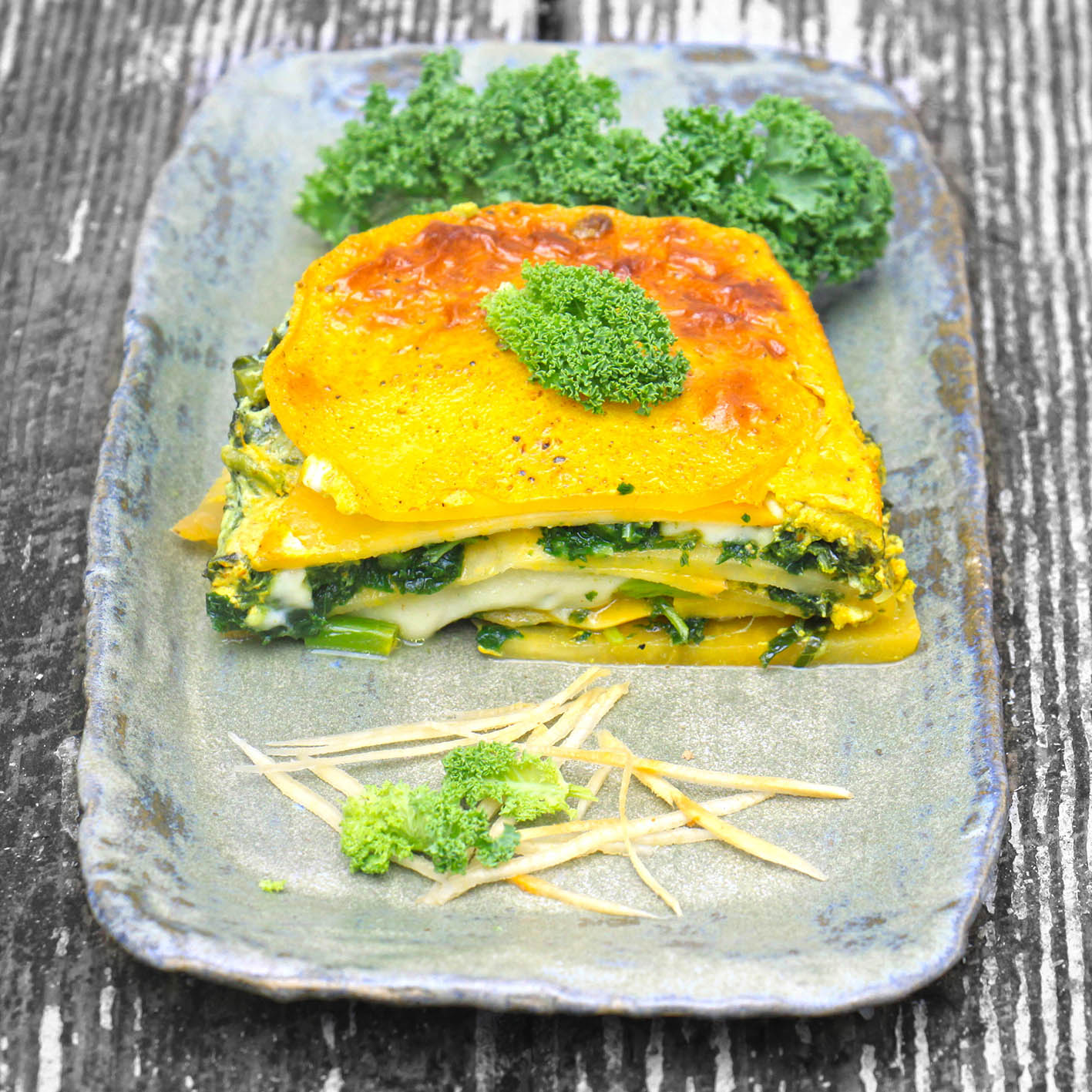 Für 2 Portionen: 1 Steckrübe schälen und in dünne (ca. 2–3 mm) Scheiben schneiden. Auf einem Blech im Ofen bei 150° ca. 15 Minuten mit etwas Olivenöl und Salz bestreut garen. 500g Grünkohl in kochendes Salzwasser geben, ca. 3 Minuten kochen lassen, dann unter kaltem Wasser abschrecken und fein hacken. Den Grünkohl mit 1 TL Kräutersalz und frisch gehacktem Majoran würzen. 150g Mozzarella in Scheiben schneiden. 1 Ei, 50 ml Sahne sowie je 1 TL Kurkuma, Kreuzkümmel und Paprika verquirlen. Eine Auflaufform am Boden mit etwas Öl einpinseln, dann alles schichten. Mit den Steckrüben beginnen, dann eine Lage Grünkohl mit Mozzarella belegen und wieder Steckrüben darauf. Mit Steckrüben abschließen und die oberste Lage mit einer Gabel einstechen und dem Sahne-Ei-Gemisch übergießen. Im Ofen bei 160° ca. 40 Minuten garen.