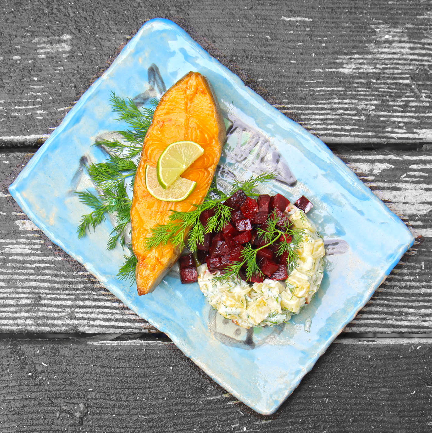 Für 2 Portionen: 1 Rote Bete und 1–2 Kartoffeln (gleiche Teile je ca. 200g) schälen und würfeln. Getrennt in ofenfeste Formen geben und mit Meersalz und Olivenöl würzen. Im 180° heißen Backofen mit Oberhitze ca. 10–15 Minuten leicht bräunen. 3 EL frisch gehackten Dill mit 150g Joghurt mischen. Die Betewürfel noch warm mit dem Saft 1/2 Limette beträufeln. Die Kartoffeln, wenn sie abgekühlt sind, mit dem Dill-Joghurt mischen. 2 Scheiben geräucherten schwarzen Heilbutt mit den Bete- und Kartoffelwürfeln anrichten. Diese erst auf dem Teller oder kurz vorher miteinander mischen, da die Farbe der Bete sonst die Kartoffelwürfel stark färbt.