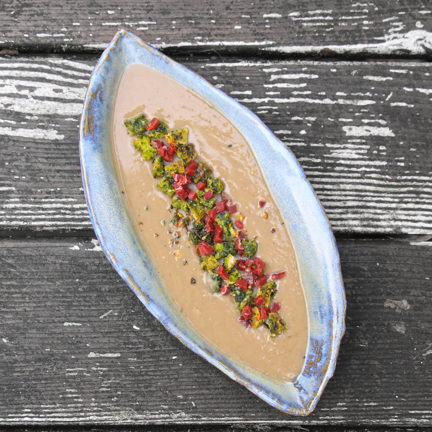 Für 2 Suppenliebhaber: 3 Schalotten schälen, würfeln und in 2 EL Olivenöl anbraten. Mit ca. 50 ml (ein guter Schuss) Weißwein ablöschen. 200g vorgegarte Maronen, 1 Zweig Rosmarin sowie 250 ml Kalbsfond dazugeben und alles ca. 20 Minuten mit geschlossenem Deckel sanft köcheln. Den Rosmarin herausnehmen, den Rest mit dem Zauberstab pürieren. Mit Trüffelsalz und grünem Pfeffer abschmecken. Schmeckt gut mit Kräuter-Croutons und gewürfeltem Hirsch-Schinken. Für die Croutons aus Rucola, glatter Petersilie und Thymian (insgesamt ca. 50g), 15g Pinienkernen, 25g geriebenem Parmesan sowie 2 EL Olivenöl eine cremige Paste pürieren (oder fertiges Rucola-Pesto nehmen) und diese beidseitig auf 2–3 etwas dickere Scheiben Weißbrot streichen. Die Brotscheiben im Backofen ca. 5–10 Minuten knusprig werden lassen, dann in Würfel schneiden.