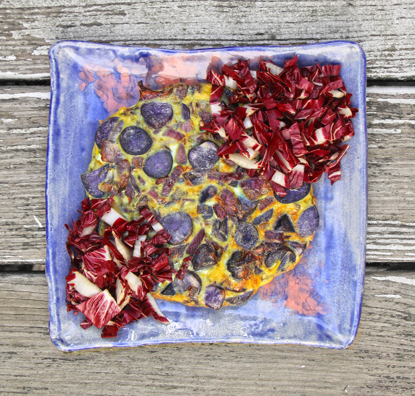 Für 2 Portionen: 1 rote Zwiebel fein würfeln und sanft glasig anschwitzen. 300g lila Kartoffeln (z.B. Vitelotte oder ähnliche Sorte) als Pellkartoffel ca. 15 Minuten weich kochen, etwas abkühlen lassen, schälen und in Scheiben schneiden. Mit den Zwiebelwürfeln mischen. 4 Blätter Salbei fein hacken. 4 Eier, den Salbei, 1 TL Salz und etwas frisch gemörserten schwarzen Pfeffer zur Kartoffel-Zwiebel-Mischung geben. In einer beschichteten Pfanne (Ø ca. 25 cm) von beiden Seiten 7–10 Minuten bei mittlerer Hitze braten. Oder im Backofen bei 200° für ca. 20 Minuten.
