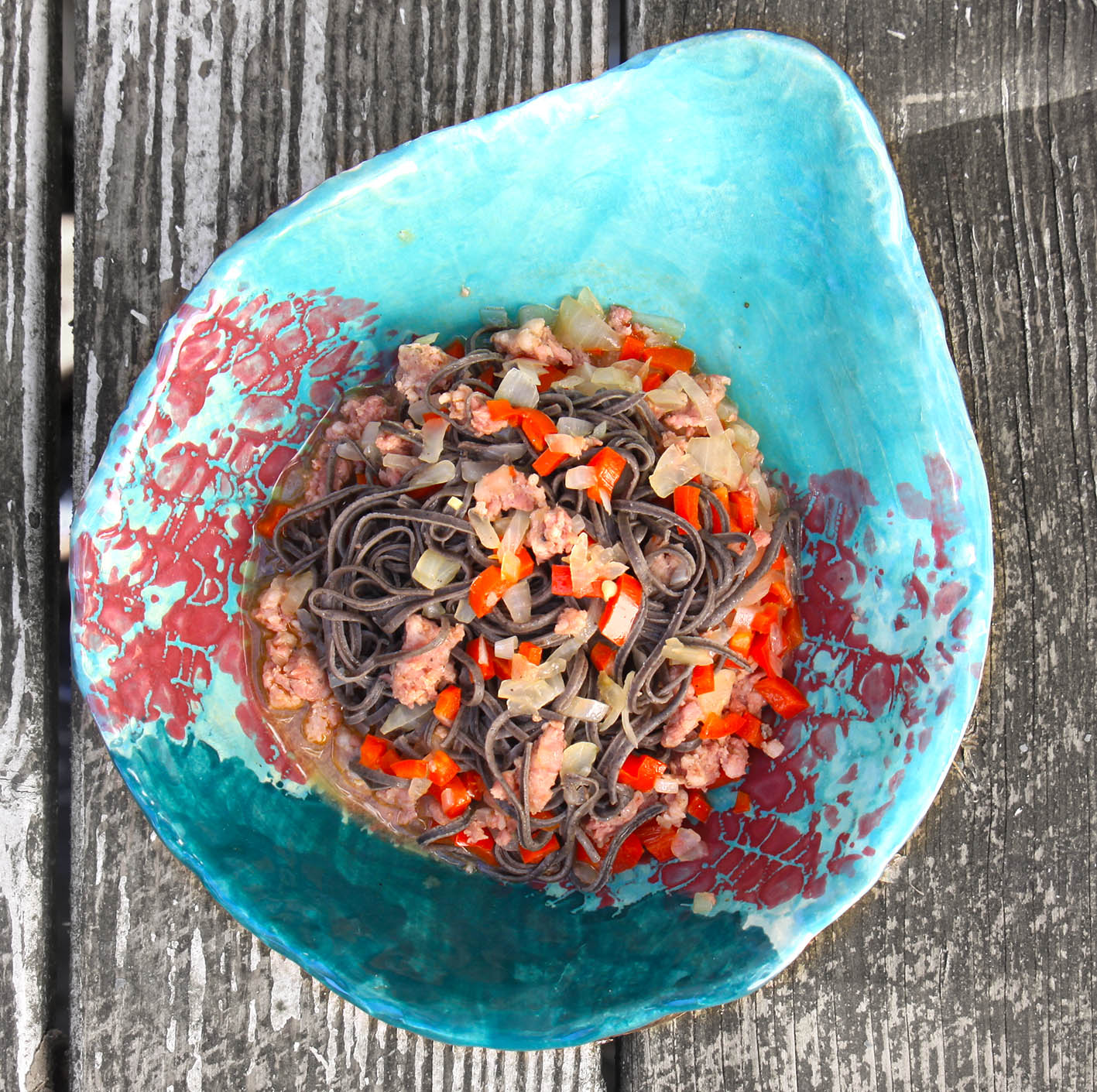Für 2 Portionen: 1 rosa Zwiebel fein würfeln. Je 1 TL Anis- und Fenchelsamen mörsern. 150g Geflügel-Hack (alternativ gewolftes helles Fleisch vom Kalb oder Salsiccia-Füllung) mit den Zwiebeln in 1 EL Olivenöl anbraten und mit Salz, weißem Pfeffer und den gemörserten Samen würzen. 1 Spitzpaprika (rot oder hell) fein würfeln und mit dem Hack mischen. Alles zusammen ca. 10 Minuten sanft köcheln. In dieser 100g Black Bean Spaghetti (z. B. von Just Taste) 5 Minuten in kochendem Salzwasser garen. Abgießen und in der Pfanne mit den Soße mischen. Mit etwas geriebenem Feta vernaschen.