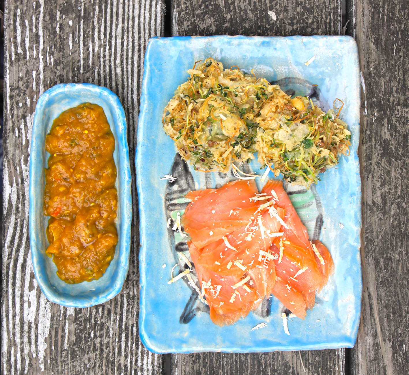 Für 2 Portionen: 150g Tempurateig-Mischung aus dem Asialaden (nach Packungsanweisung) mit 175 ml eiskaltem Wasser schnell verrühren. 1 Sprossenglas gemischte Sprossen (z. B. Vitalmix) ernten und portionsweise (4–6) in den Teig geben, mit einem Löffel herausnehmen und anschließend in heissem Kokosöl goldbraun ausbacken. 200g Räucherlachs auf 2 Teller verteilen und mit den Sprossentempuras anrichten. Dazu schmeckt eine süß-scharfe Mango-Soße. Dafür 1 Mango und 1 Stängel Zitronengras und 1 kleine rosa Zwiebel fein würfeln. Alles in 1 EL Sesamöl anbraten. Mit 50 ml Reisessig ablöschen ca. 15 Minuten einkochen. Mit Salz, fein gehackter roter Chili und Limetten-Saft und -Abrieb abschmecken.
