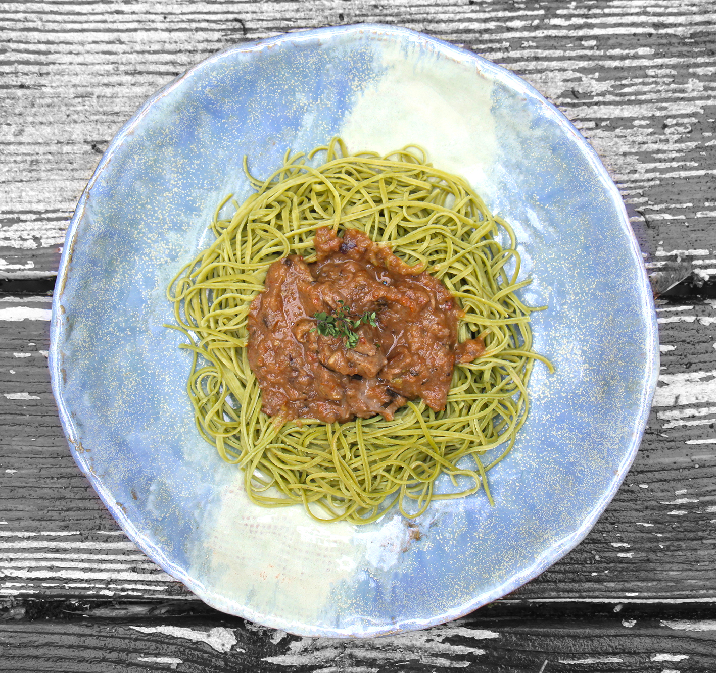 Für 2 Left(l)overs: Von einer fertig geschmorten Lammkeule oder Schulter ca. 150g Fleisch in Stücke schneiden oder abzupfen. 1 süße (rosa) Zwiebel würfeln und mit 5 eingelegten getrockneten Tomaten und 1 Knoblauchzehe in 2 EL Olivenöl anbraten. 1 TL Senf und 1 EL frischen Thymian dazu geben und mit 200 ml Lammfond ablöschen. Alles mit geschlossenem Deckel ca. 15 Minuten köcheln, dann mit dem Zauberstab pürieren und das Fleisch in die Soße geben. 100g Edamame Spaghetti (z. B. von Just Taste) 5 Minuten in kochendem Salzwasser garen. Abgießen und in der Pfanne mit den Soße mischen. Mit etwas geriebenem Feta oder einfach so vernaschen.