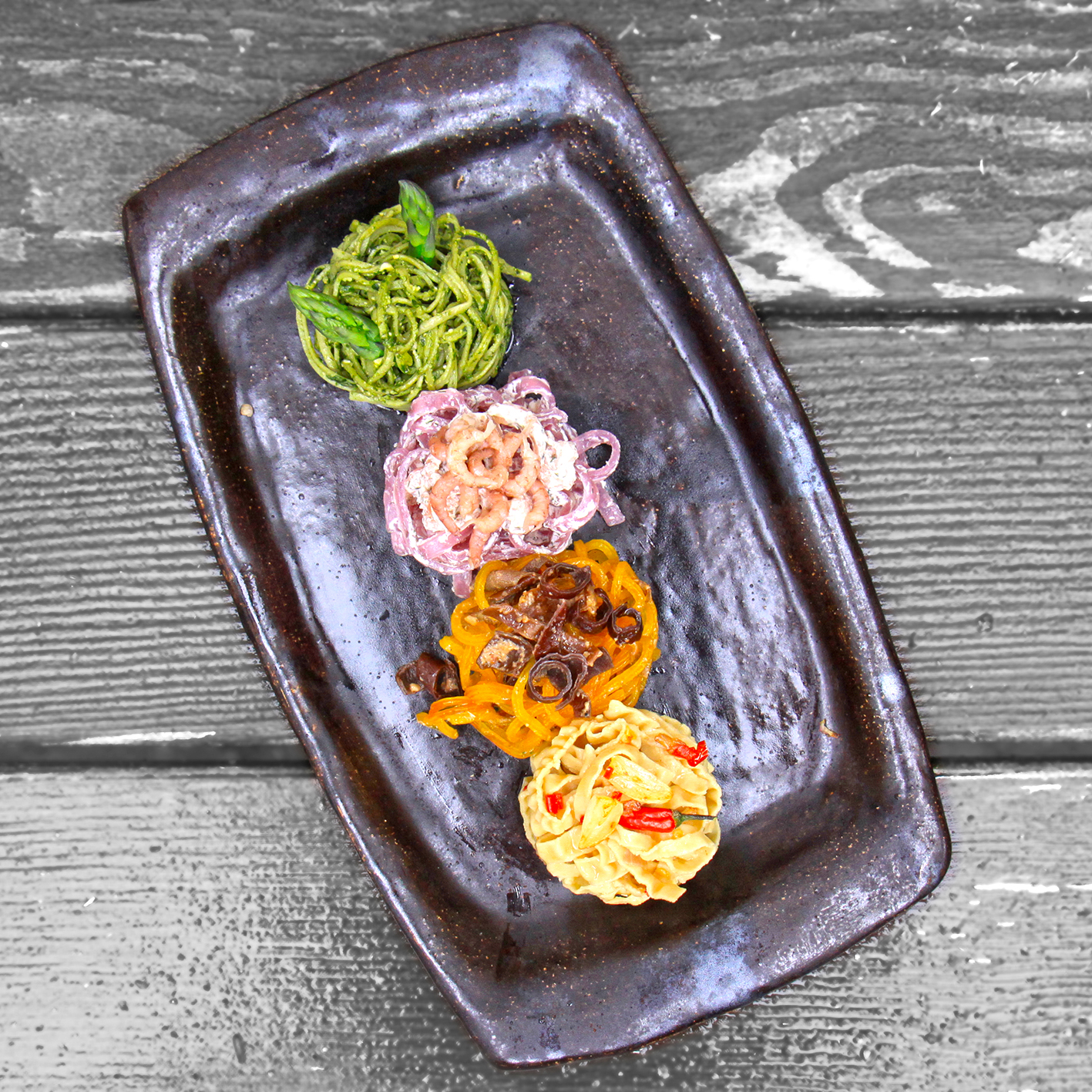 Winter: 40 g Kichererbsen-Fettuccine 5 Minuten kochen. 1/2 süße Zwiebel, 3 Knoblauchzehen und 2 rote Chilischoten (ohne Kerne) in 3 EL Olivenöl anschwitzen und mit den Nudeln mischen.