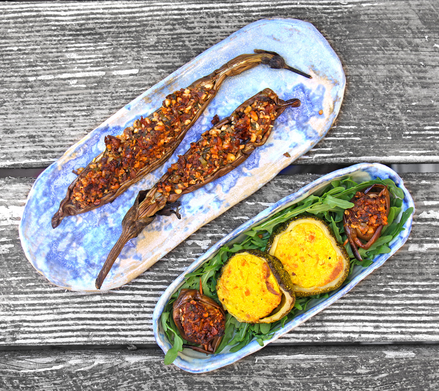 Für 2 Portionen oder für 4 als Vorspeise: 24 Stunden vor dem geplanten Essen. 3 EL weissen Basmati-Reis und 2 EL Urid Dal (weisse Linsen) einweichen. Nach 12 Stunden das Wasser abgießen und das Reis-Linsen-Gemisch mit einem EL Wasser pürieren. Bei Zimmertemperatur weitere 12 Stunden ruhen lassen. 1 Kugel-Zucchini aushöhlen, den Decklel aufheben. 1/2 Möhre, 1 Knoblauchzehe und etwas frischen Kurkuma (ca. 2 cm) fein würfeln und in 1 TL Sesamöl andünsten. Mit der Reis-Paste und 1 TL Tapioka-Perlen mischen und in die Zucchini füllen und den Deckel auflegen. Diese in eine kleine ofenfeste Form setzten und im Backofen bei 160° ca. 20 Minuten garen. Etwas abkühlen lassen und in Scheiben schneiden. Mit einem Sparschäler bei 4 Schlangen-Auberginen jeweils 1 Streifen Schale entfernen. Die Auberginen im Ofen ca- 15 Minuten weich garen. In dieser Zeit. 40g Pinienkerne, 10 getrocknete (eingelegte) Tomaten und 150g Kalamata-Oliven (dunkel/ohne Stein) und 1 Knoblauchzehe klein würfeln. Alles gut mischen mit Thymian, Salz und Pfeffer würzen. Die Auberginen nach dem garen etwas abkühlen lassen, an der Schälstelle einschneiden und auseinanderdrücken. Auf einen ofenfesten Teller legen und im Backofen mit Grillfunktion etwas gratinieren.