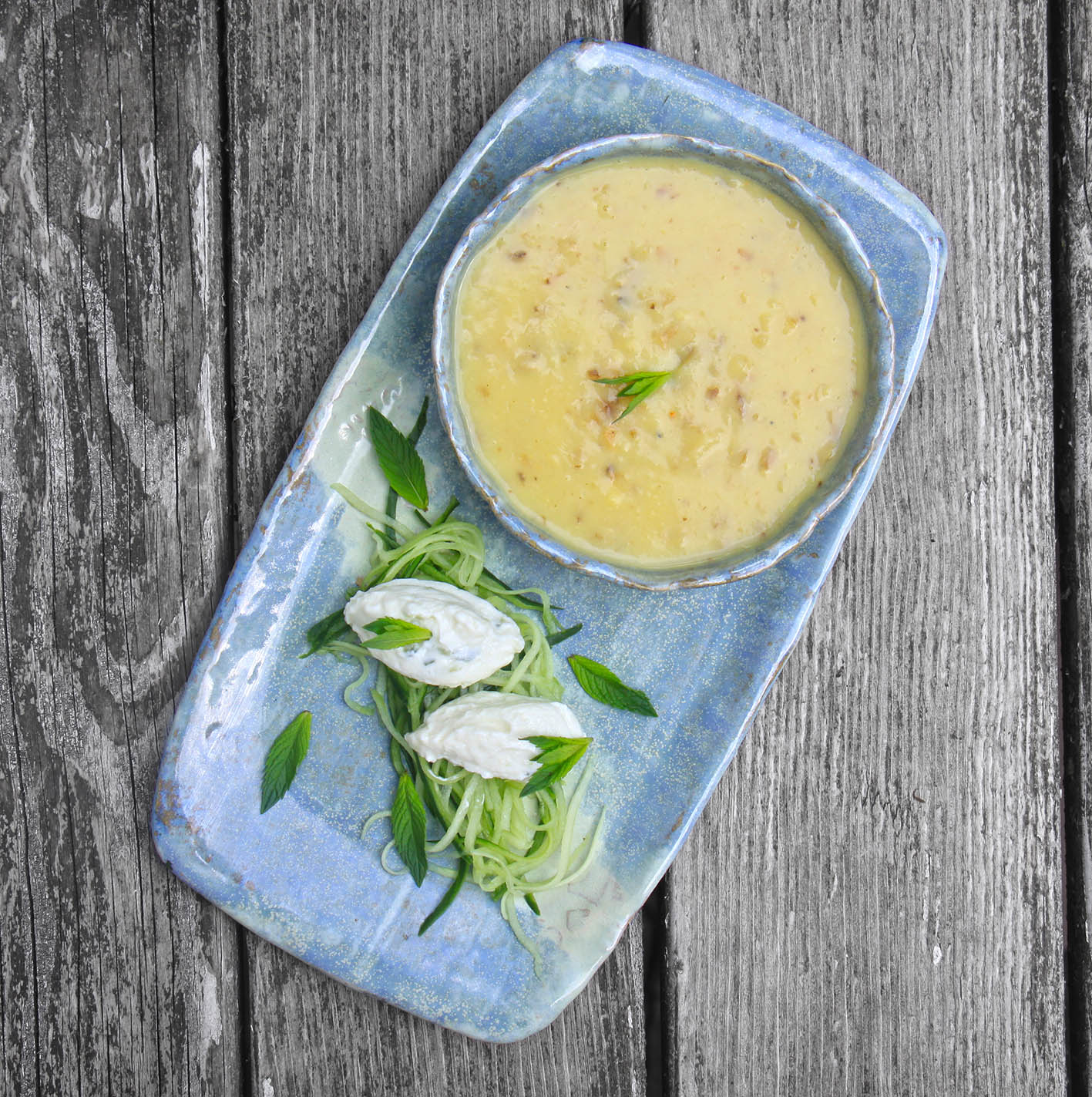 Für 2 Griechenland-Fans: 4 große Kartoffeln in ca. 4cm Scheiben schneiden. 2 EL Olivenöl und den Saft 1 Zitrone mischen und auf ein Backblech geben. 1 TL grobes Meersalz hineinstreuen und die Kartoffelscheiben darin wenden. Den Backofen mit Grillfunktion auf 200° vorheizen und die Kartoffelscheiben ca. 20 Minuten garen bis Sie eine zarte Bräunung haben. Mit dem Zitronen-Öl-Gemisch vom Blech und 1/4 L Brühe pürieren. Wenn die Suppe dann noch zu fest ist, Esslöffelweise Joghurt oder Buttermilch unterrühren. Von 1/4 Salatgurke die weiche Mitte mit den Kernen entfernen. Die festen Teile raspeln und mit 250g griechischem Joghurt (Fettgehalt 10%), 1 Knoblauchzehe und etwas Salz gut mischen. 1 Zitrone auspressen den Saft erhitzen und 2 TL Agartine darin auflösen und (nach Packungsanweisung) 1 Minute kochen. Etwas abkühlen lassen und mit dem Joghurt mischen und ca. 3 Stunden kalt stellen. Zum Servieren Nocken abstechen und einige Minzblätter fein schneiden und über Nocken und Suppe streuen.