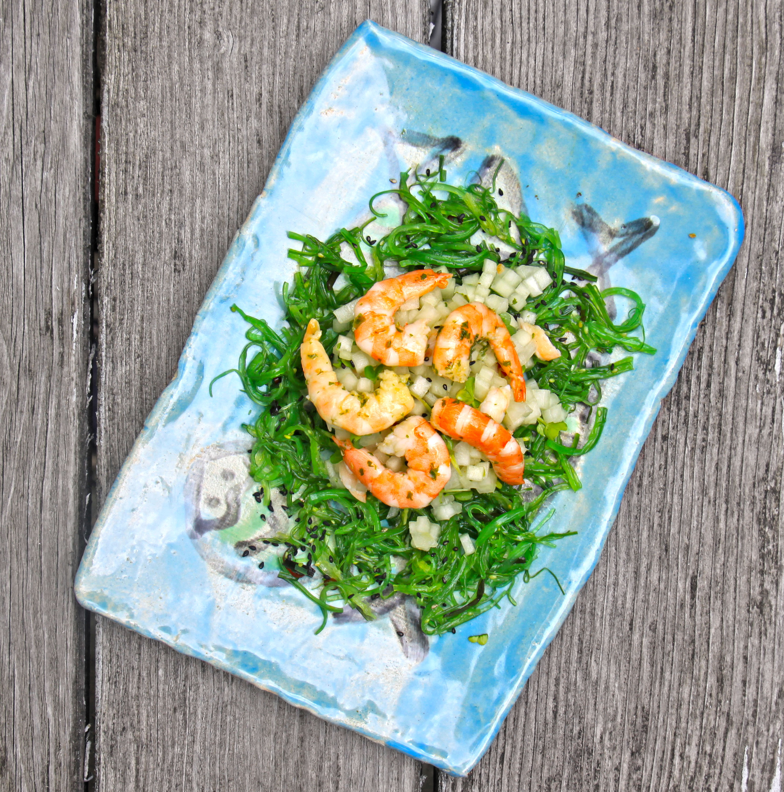 Leichtes Sommergericht für 2: 1/4 Netzmelone in kleine Würfel schneiden (ca. 2x2mm). 4 verzehrfertige Garnelen ebenfalls fein würfeln. 1 Limette auspressen und den Saft mit 2 EL Sesamöl verrühren. 1 kleine grüne Chili ohne Kerne fein hacken. Alles gut mischen und etwas durchziehen lassen. Jetzt 8 Garnelen in etwas Sesamöl 1–2 Minuten braten. Auf zwei Tellern etwas Salat (im Bild Wakame) geben, die Melonen-Garnelen-Mischung darauf anrichten und die frisch gebratenen Garnelen als Toping servieren. Mit Radieschen-Sprossen garnieren.