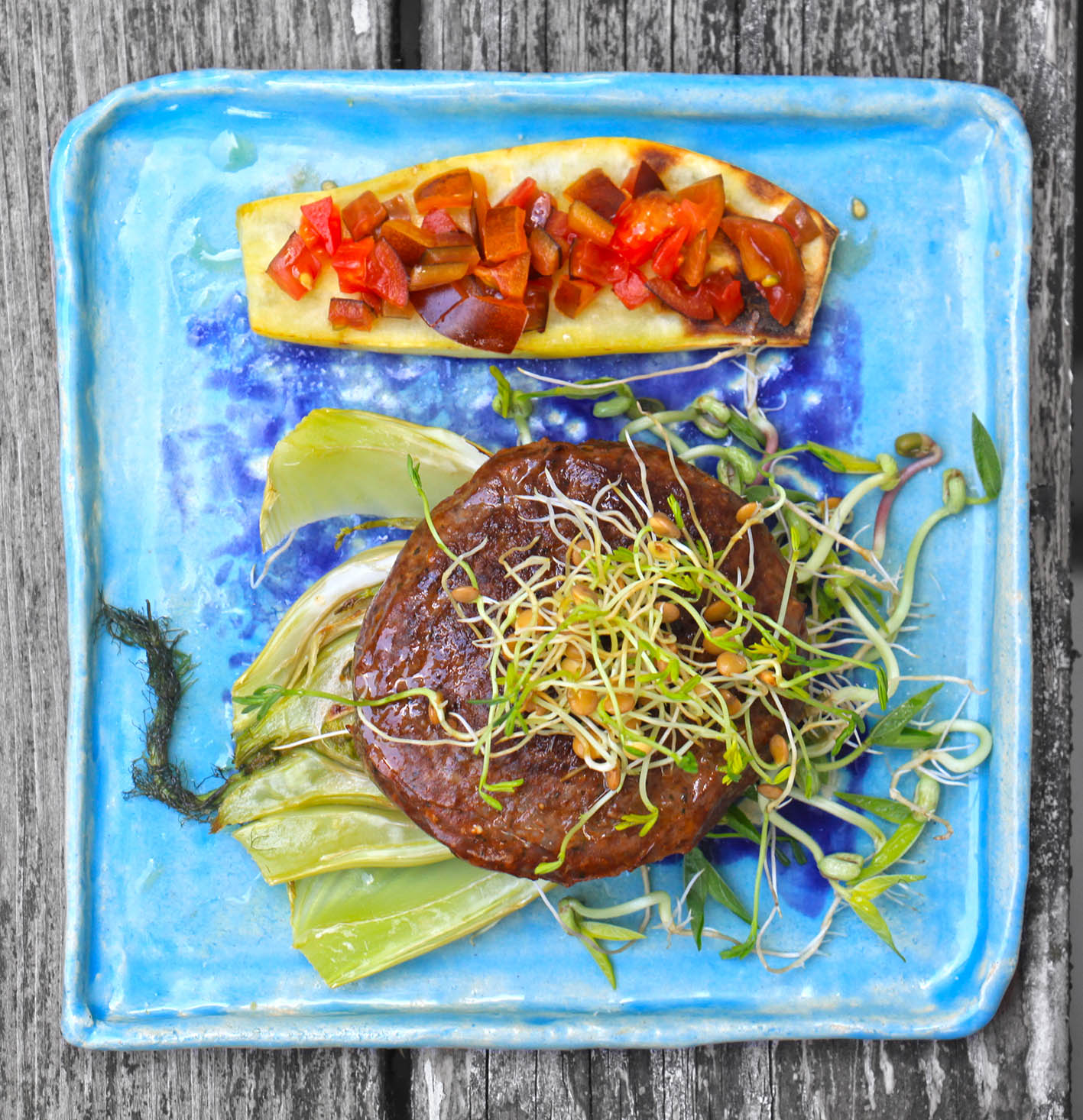 Leichtes Sommergericht für 2: 250g gewolftes Kalbfleisch (z.B. aus der Hüfte) mit frischem Knoblauch und Paprikapulver sowie Salz und Kapern gründlich vermengen und 2 Patties daraus formen. 1 dicke Fenchelknolle und 1 gelbe Zucchini (oder Kugelzucchini) in ca. 1 cm dicke Scheiben schneiden, mit Olivenöl bepinseln und grillen bis sie schön gebräunt sind. 1 Ochsenherztomate entkernen und würfeln und mit Salz, etwas Chili (oder Pfeffer) und Öl würzen. 2 handvoll Linsensprossen ernten. Die Patties von beiden Seiten 2–3 Minuten anbraten und bei wenig Hitze (z.B. in der Pfanne mit Deckel oder im Ofen) 10 Minuten nachziehen lassen. Das Fleisch auf dem gegrillten Fenchel und die Tomatenstücke auf den Zucchinischeiben anrichten. Mit Sprossen bestreut servieren.