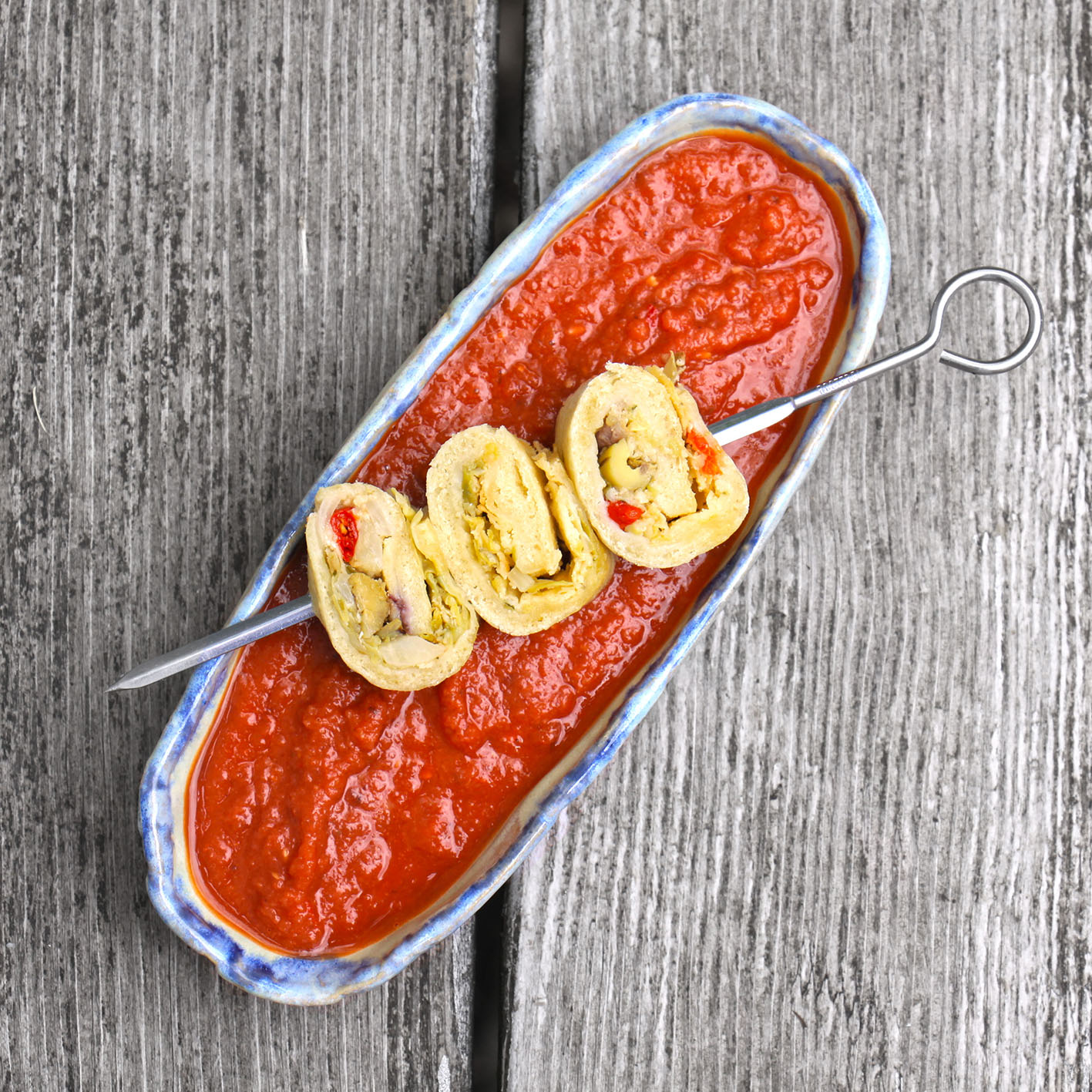 Für 2 Genießer: 50g Kalamata-Oliven, 400g frische und 50g getrocknete Tomaten sowie 100g Knollensellerie mit 1 TL Salz und 3 EL Olivenöl pürieren. Fertig. Für die Einlage ein dünnes Fladenbrot (mit Hefe) backen Ø ca. 30 cm (große Pfanne). Dafür 1/4 Würfel Hefe, 1/2 TL Salz, eine Prise Zucker und ca. 50ml lauwarmes Wasser gut verrühren. 100g Pizzamehl und 1 EL Öl dazu geben und zu einem glatten Teig rühren. 1 Stunde abgedeckt ruhen lassen. In dieser Zeit 5 getrocknete, eingelegte Tomaten 2 eingelegte Peperoni und 10 Oliven würfeln. 50g Parmesan reiben. Den Teig zu einer Kugel formen und diese in Pfannengröße dünn ausrollen. Eine Pfanne (für die es einen Deckel gibt) mit etwas Öl einstreichen und das Brot ca. 2 Minuten backen, wenden und mit dem gewürfelten Gemüse und dem Käse belegen. Den Deckel auf die Pfanne geben und das Brot ca. 5 Minuten bei leichter Hitze zu Ende backen. Aufrollen, in Scheiben schneiden und auf Spießen in der Suppe anrichten.