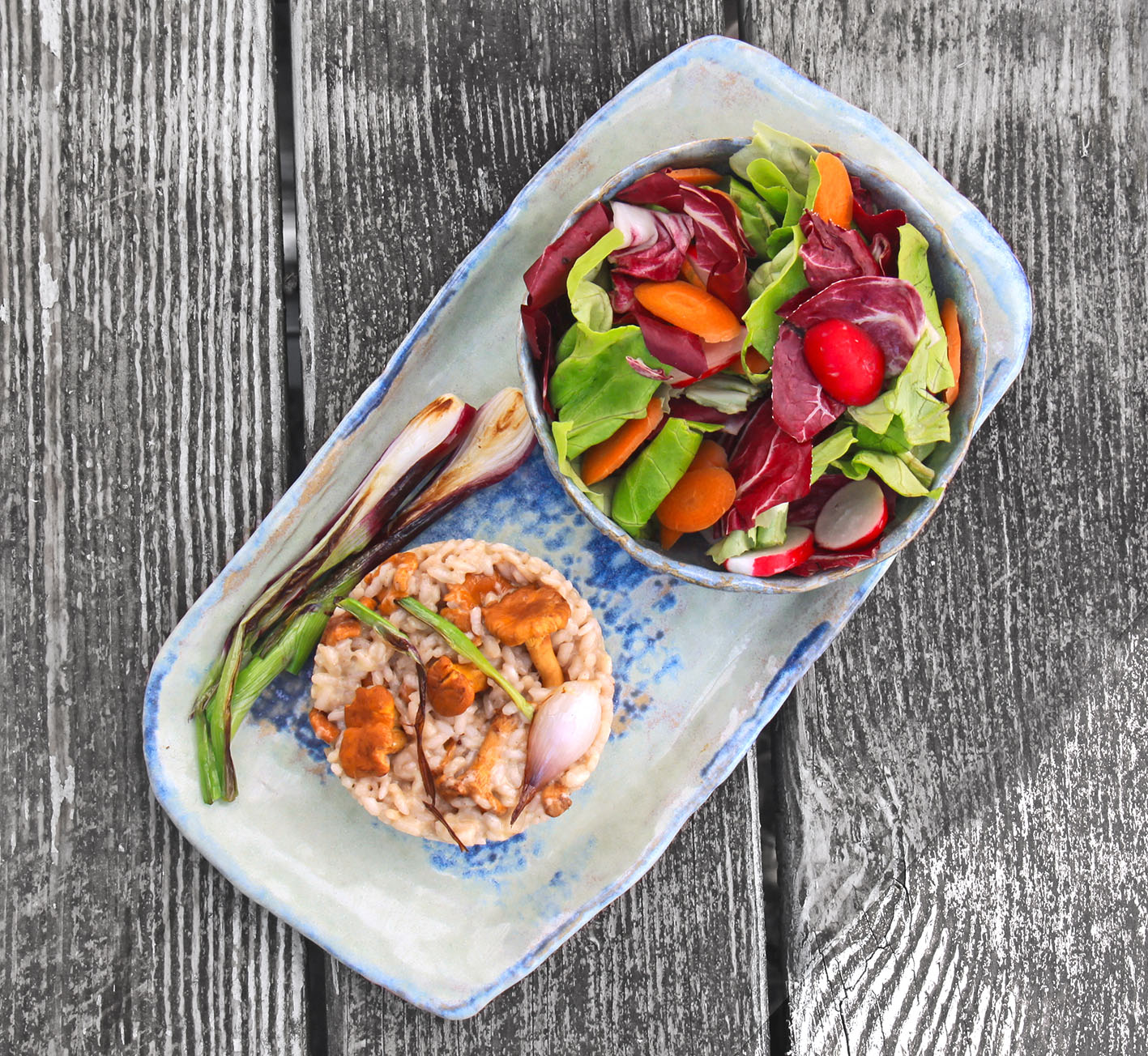 Für zwei Pfifferling-Liebhaber: 2 rote Frühlingszwiebeln mit etwas Grün längs halbieren 2 Weitere fein würfeln. 250g Pfifferlinge putzen, große Pilze halbieren. In einem breiten Topf 2 EL Öl erhitzen die halbierten Zwiebeln anbraten bis sie leicht gebräunt sind und wieder herausnehmen. Nun die gewürfelten Zwiebeln anschwitzen. 2 Tassen Risottoreis (Rundkorn) dazu geben und nach 1 Minute mit 1 Tasse Rosé ablöschen. Dann weitere 2 Tassen Flüssigkeit, z.B. Pilzfond (alternativ Gemüsefond), nach und nach unterrühren. Nach 10 Minuten die Pfifferlinge auf den Reis geben und mit Trüffelsalz und 1TL Wildgewürz (z.B. Waldeslust von Herbaria) würzen und mit geschlossenem Deckel bei wenig Hitze 10 Minuten weiterköcheln lassen – nach Bedarf noch etwas Flüssigkeit dazu geben. 100g geriebenen Bergkäse unterrühren und mit Salat und den gebratenen Zwiebeln vernaschen.