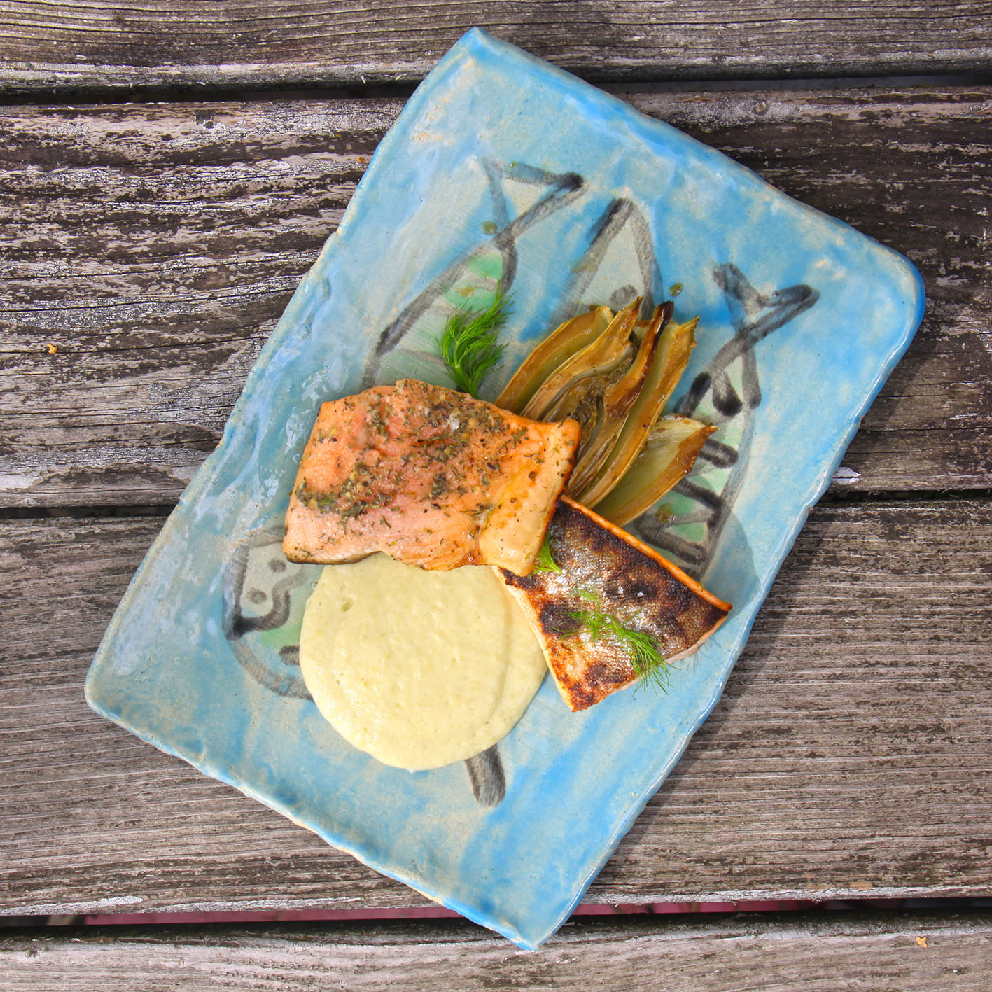 Für zwei: 1EL Zitronenthymian, 2EL Olivenöl und 1/2TL Salz gut verrühren und 400g Saiblingfilet (mit Haut) damit 1–2 Stunden marinieren. 2 Fenchelknollen in Stücke schneiden und in 100ml Kochsahne ca. 25 Minuten weich kochen. Mit dem Zauberstab pürieren. 1 weitere Fenchelknolle in 4 Scheiben schneiden, diese mit je 1Tl Honig bestreichen und zusammen mit 1 mittelgroße Kartoffel (halbiert) im Backofen bei 180° ca. 25 Minuten backen. Die Kartoffel mit einer Gabel zerdrücken und mit dem Fenchelpüree mischen. Den Fisch auf der Haut braten oder grillen – in der Pfanne nach 2 Minuten die Hitze reduzieren und mit Deckel weiterbraten bis der Fisch auch an der Oberseite nicht mehr roh aussieht (das dauert je nach Dicke der Filets 2–3 Minuten). Mit dem Püree und der gebackenen Fenchelscheibe anrichten.