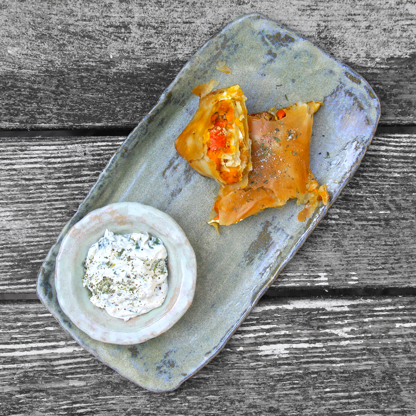 Für 4 Strudelfans: 1 mittleren Hokkaido halbieren, die Kerne entfernen und im Backofen bei 180° ca. 15 Minuten garen. Etwas abkühlen lassen und in Scheiben schneiden. Mit 1TL Kräutersalz, 10 gehackten Walnüssen und 200g Ziegen-Feta mischen. 6 Filoteigblätter bereit legen. 80g Butter schmelzen. 1 Teigblatt mit Butter einpinseln, 1 weiteres Teigblatt darauf legen, dieses auch einpinseln und mit 1EL Brösel bestreuen. Die Hälfte der Kürbis-Masse auf dem Teig verteilen. 1 drittes Teigblatt darauf legen. Die Seiten einschlagen und von der langen Seite aufrollen. Das geht gut auf einem Tuch. Die Rolle mit der offenen Kante nach unten auf ein Blech (mit Backpapier) legen und nochmals mit Butter einpinseln. Mit den restlichen 3 Teigblättern und der zweiten Hälfte der Kürbis-Masse genauso verfahren. Die Strudel bei 180° ca. 20 Minuten backen. Mit Kräuterschmand lauwarm vernaschen.