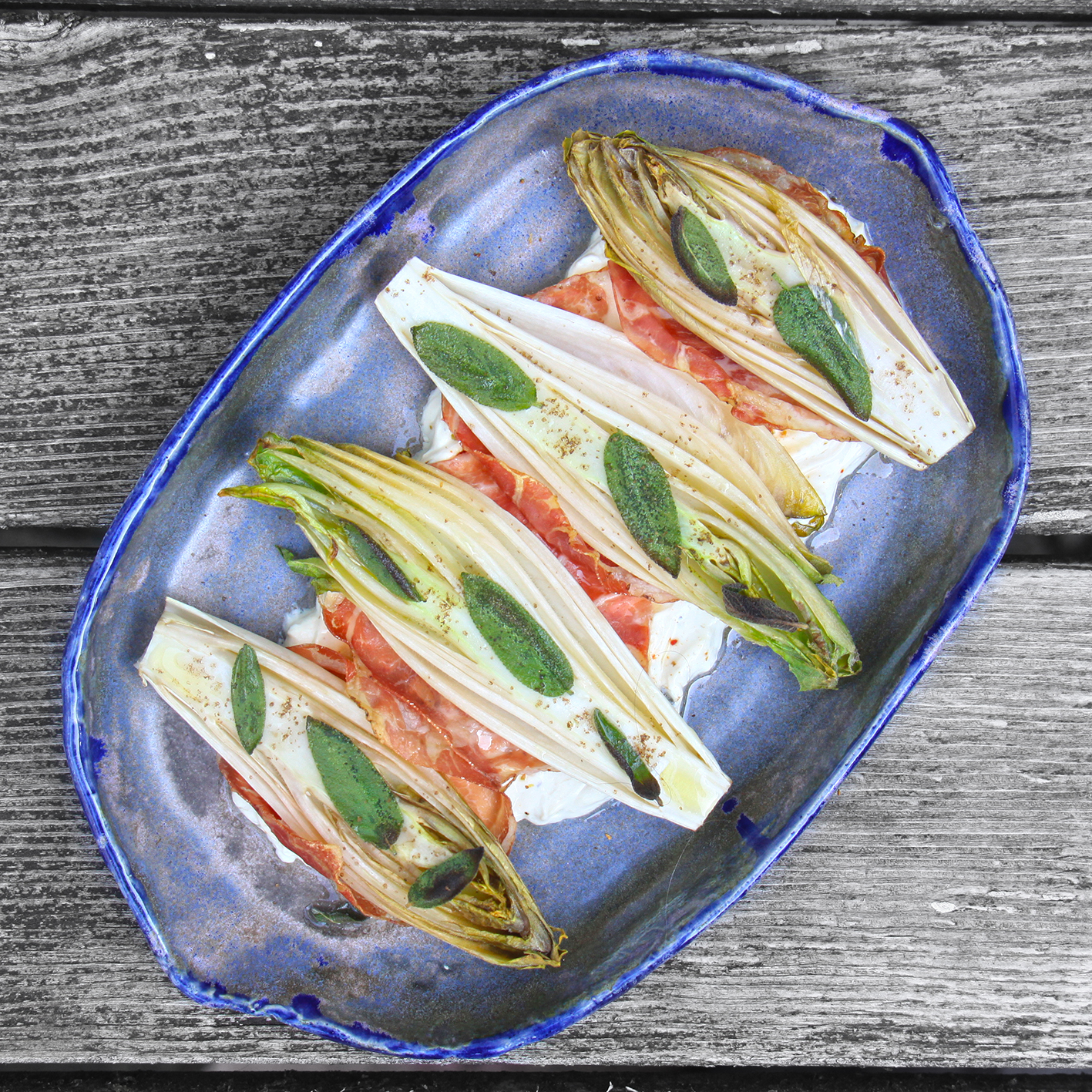 Leichtes Lunch: Den Grill vom Backofen vorheizen. Pro Portion ca. 50g Frischkäse mit Kräutern und geräuchertem Meersalz mischen und auf einen ofenfesten Teller geben. 2 Chicoree vorsichtig halbieren und jede Hälfte in eine hauchdünne Scheibe Pancetta Maigre „wickeln“ oder Räuchertofu dünn aufschneiden, mit etwas Paprika bestreuen und unter den Chicoree legen. Die Chicoree-Hälften mit der Schnittkante nach oben auf den Frischkäse setzen. 2EL Olivenöl mit 1TL Honig verrühren und die Schnittfläche damit bestreichen, jeweisl mit 2–3 Salbei-Blättern belegen (je nach Größe) und ca. 5 Minuten grillen.