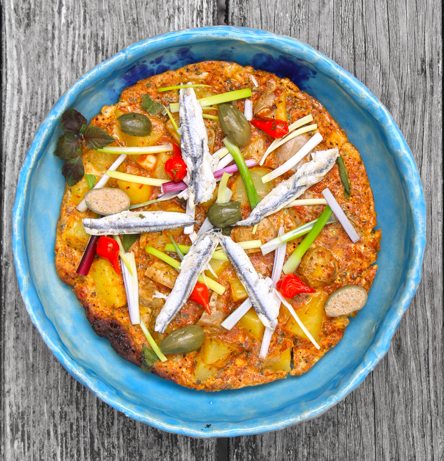 Für eine Pfanne ø 25cm: 3 mittelgroße Kartoffeln gut waschen und bürsten und mit Schale für 25 Minuten bei 180° im Backofen garen. 2 Knoblauchzehen hacken. 1 getrocknete Tomate und 1 getrocknete Paprika (oder 1 EL Ajvar) zusammen klein hacken oder in einer Küchenmaschine heckseln. 3 Eier und 1 TL Kräutersalz und die anderen Zutaten gründlich mischen. Die Kartoffeln hineinschneiden. In einer kleinen Pfanne (für den Backofen geeignet) 2 EL Olivenöl erhitzen die Kartoffel-Eier-Masse hinein geben (Hitze etwas zurückdrehen) und ca. 10 Minuten braten. Dann im Backofen mit der Restwärme vom Kartoffel backen garziehen lassen. In der Zwischenzeit 1 Frühlingszwiebel in feine Streifen schneiden und 3–4 Kapernäpfel halbieren. Die fertige Tortilla mit Zwiebeln, Kapern und einigen Mini-Paprika (Sweet Drop) sowie 5 eingelegten Sardinen-Filets belegen.