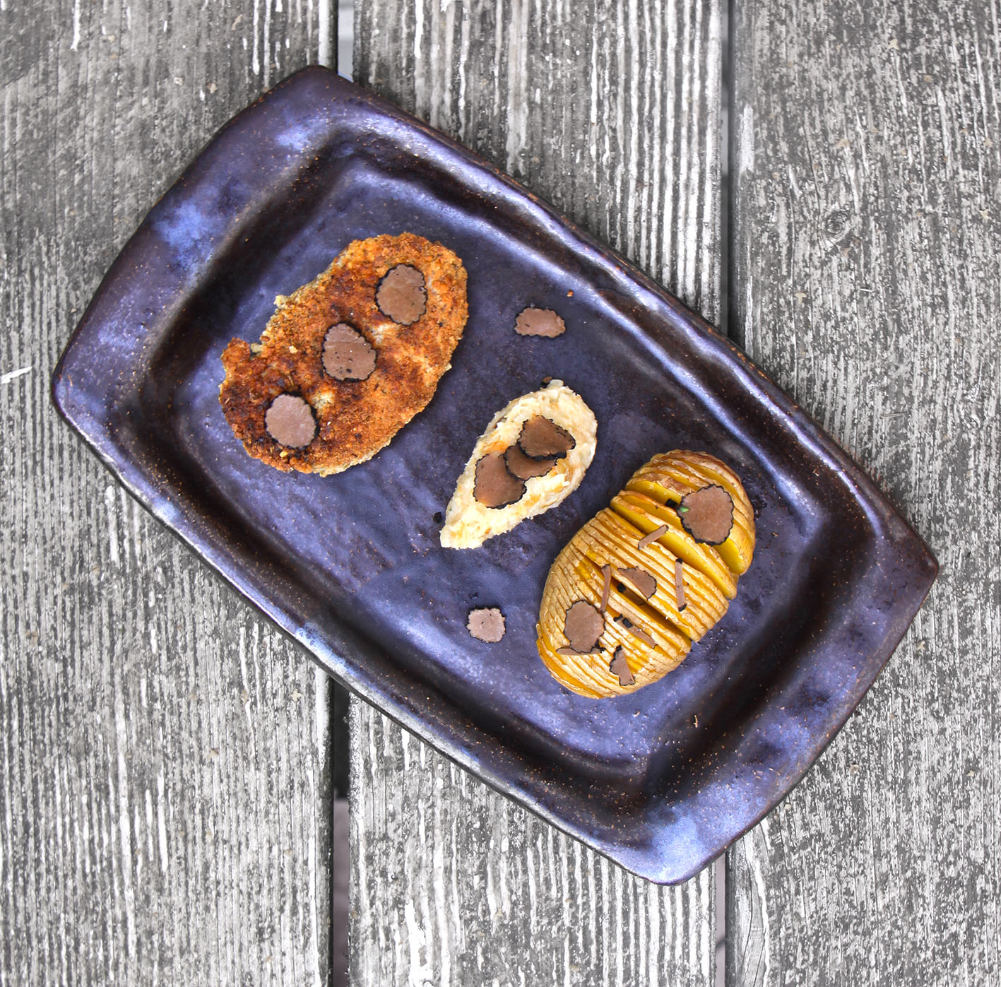 2 große Kalbsschnitzel sehr dünn „klopfen“ und mit einer Prise Trüffelsalz und wenig Senf einreiben. 1 Scheibe getrüffelten Kochschinken und 1 Scheibe getrüffelten Weichkäse auf eine Hälfte legen, zuklappen und an der offenen Seite mit einem Holzstäbchen fixieren. Rundherum panieren. Von jeder Seite 3 Minuten braten und noch ca. 10 Minuten ruhen lassen (z.B. im Backofen bei 70°). Als Beilage passen getrüffelte Fächerkartoffeln und Petersilienwuzelpüree. Für die Fächerkartoffeln: festkochende Kartoffeln im Abstand von 2–3mm einschneiden, dabei darauf achten, nicht ganz durchzuschneiden. In die Fächer Trüffelbutter streichen. Die Kartoffeln im Backofen bei 180° ca. 30 Minuten backen. Für das Püree 4–5 Petersilienwurzeln waschen und in Stücke schneiden. In Kochsahne ca. 15 Minuten weich kochen und dann mit dem Zauberstab pürieren. Mit 1EL Trüffelbutter und Salz abschmecken. Zum Servieren noch etwas frischen Trüffel über das Gericht hobeln.
