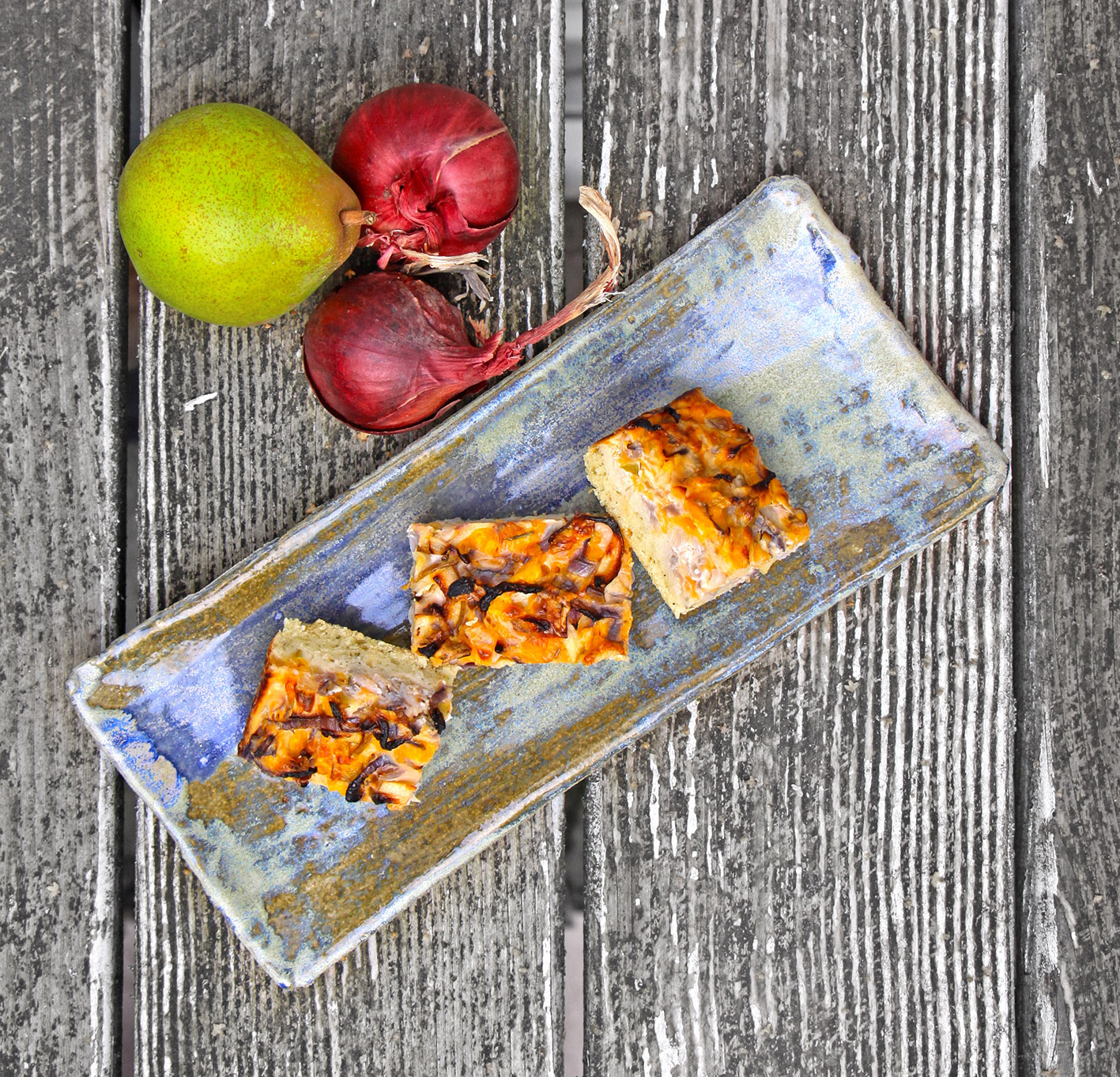 Für 4–6 als Snack: 30g Hefe mit 50 ml lauwarmem Wasser, 1 Prise Zucker und 1TL Salz glatt rühren. 2EL Olivenöl, 1EL gehackte Kräuter (z.B. Rosmarin, Thymian, Minze) und 300g Mehl zufügen und zu einem homogenen Teig rühren. Abgedeckt an einem warmen Ort mindestens 1 Stunde gehen lassen. 3 große rote Zwiebeln und 1 große Birne in dünne Ringe bzw. Streifen schneiden. 3 Eier und 200g geriebenen Cheddar und 1TL geräuchertes Meersalz und etwas frisch gemörserten Langpfeffer dazu geben und mit Zwiebel und Birne gründlich mischen. Eine Form mit hohem Rand (ca. 20×30 cm) mit Backpapier auslegen. Den Hefeteig (der darf ruhig sehr weich sein) hinein geben und gleichmäßig am Boden verteilen. Den Backofen (Heißluft + Unterhitze) auf 200° vorheizen. Die Zwiebel-Mischung auf den Teig geben in den heißen Ofen schieben. Nach 5 Minuten den Ofen auf 160° herunter schalten und 30 Minuten weiter backen.