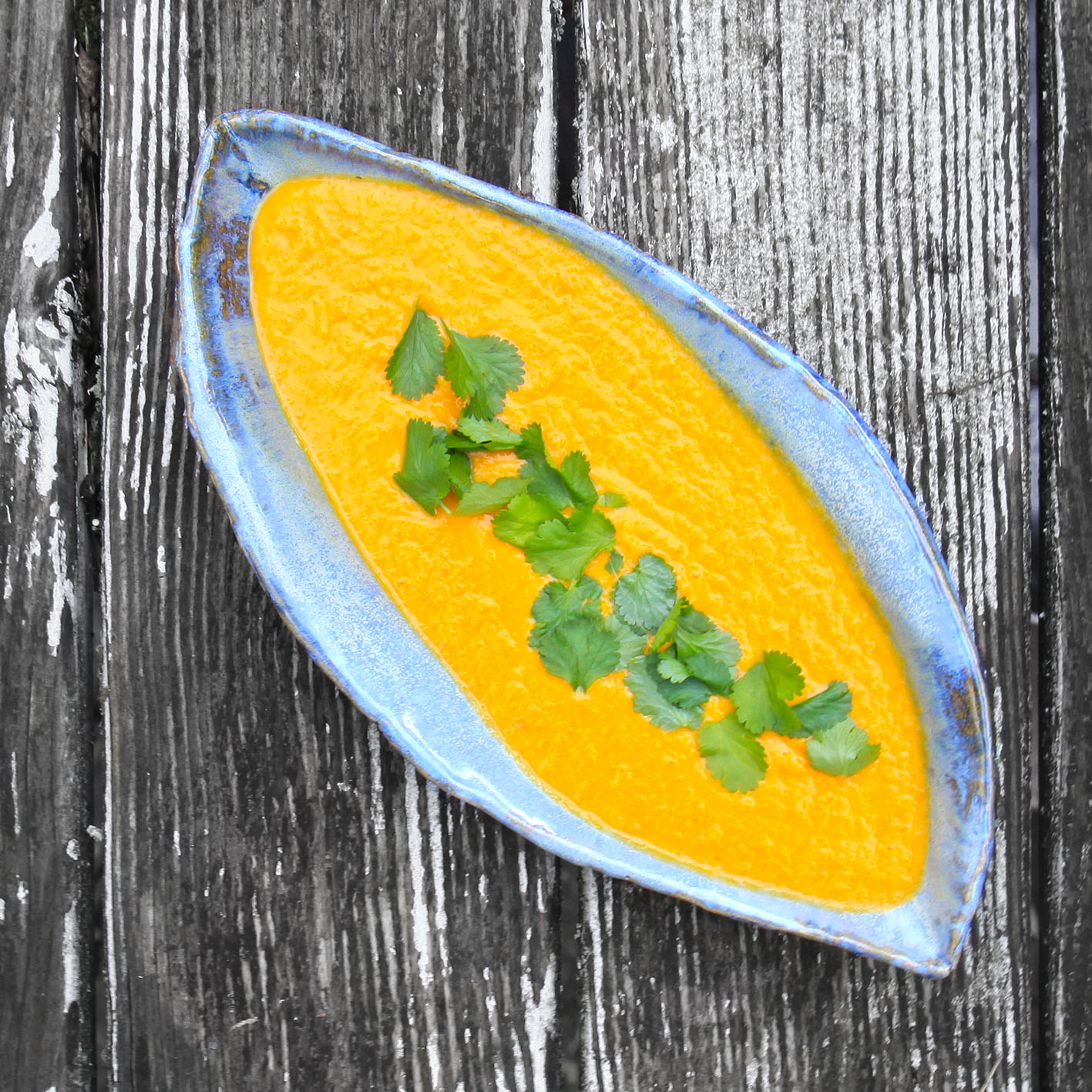 Leichte, scharfe Suppe für zwei: 2 große Möhren in Scheiben schneiden. 2 Knoblauchzehen und ca. 2cm Ingwer schälen, grob würfeln und mit den Möhren in einem Topf mit Deckel in ca. 100ml Wasser und 1/2 TL Salz etwa 10 Minuten köcheln. 1/2 Mango würfeln und dazu geben. 150ml Kokosmilch ebenfalls in den Topf geben und mit dem Zauberstab pürieren. Mit je 1/4 TL Kreuzkümmel und Kurkuma würzen und mit Chili und Salz (oder Chilisalz) abschmecken. Mit frischen Koriander-Blättchen bestreuen.