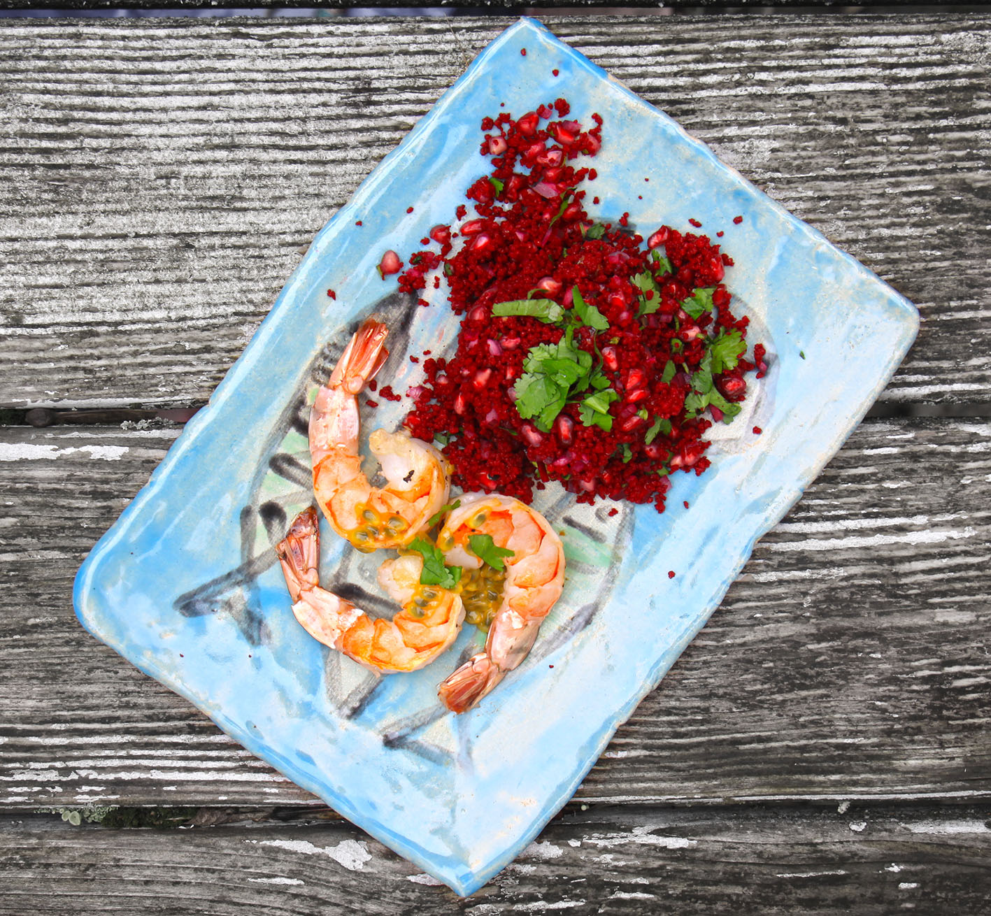 Für zwei Verliebte: 6 Black Tiger Garnelen waschen, schälen (Schwanzflosse dranlassen) und den Darm entfernen. Trocken tupfen. 200ml Rote Bete Saft aufkochen und 100g Dinkel Couscous damit übergießen. 10 Minuten quellen lassen. 1/2 Granatapfel entkernen, 1 kleine rote Zwiebel sehr fein würfen, 3 El Korianderblätter fein hacken und alles mit dem Couscous mischen. Mit Salz und dem Saft 1/2 Limette abschmecken. In einer Pfanne 1 EL Sesamöl erhitzen und die Garnelen auf beiden Seiten ca. 1 Minute anbraten, bis sie schön Farbe angenommen haben. Dann die Hitze stark reduzieren (oder bei Elektroherd abschalten) und die Garnelen in der Pfanne „aufstellen“ und noch etwas nachziehen lassen. 2 Maracujas aufschneiden. Die Garnelen mit dem Coucous anrichten und mit dem Fruchtfleisch der Maracujas toppen.