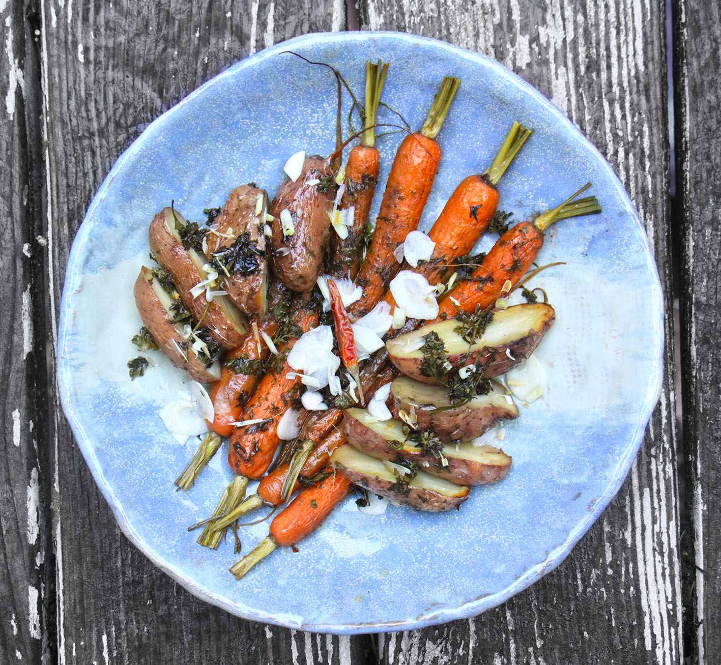 Für 2: 300g Möhren (vorzugweise mit Grün) und 300g (kleine) Kartoffeln putzen und entweder die Kartoffeln nur halbieren und die Möhren im Ganzen lassen oder alles in große Stücke schneiden. 2 Tomaten häuten und würfeln. 1 Zwiebel fein gehackt anbraten – Masala-Tandoori-Mischung (Kreuzkümmel, Mangopulver, Granatapfelpulver, Koriander-Samen, (gemahlen), schwarzen Senf, Cayenne-Pfeffer) dazugeben und mit den gewürfelten Tomaten ablöschen. Alles gut verrühren. Kartoffeln und Möhren in die Soße legen und noch ca. 20 Minuten mit Deckel köcheln, bis die Kartoffeln gar sind. Oder die Tomaten-Gewürz-Soße in eine Auflaufform geben, das Gemüse hineinlegen und bei 180° ca. 20 Minuten garen. Mit frischem Knoblauch und getrocknetem Möhren-Grün bestreut servieren. Probiert auch anderes (Wurzel)Gemüse für dieses Rezept: z.B. Kohlrabi, Kürbis, Steckrübe, Pastinaken oder Maniok.