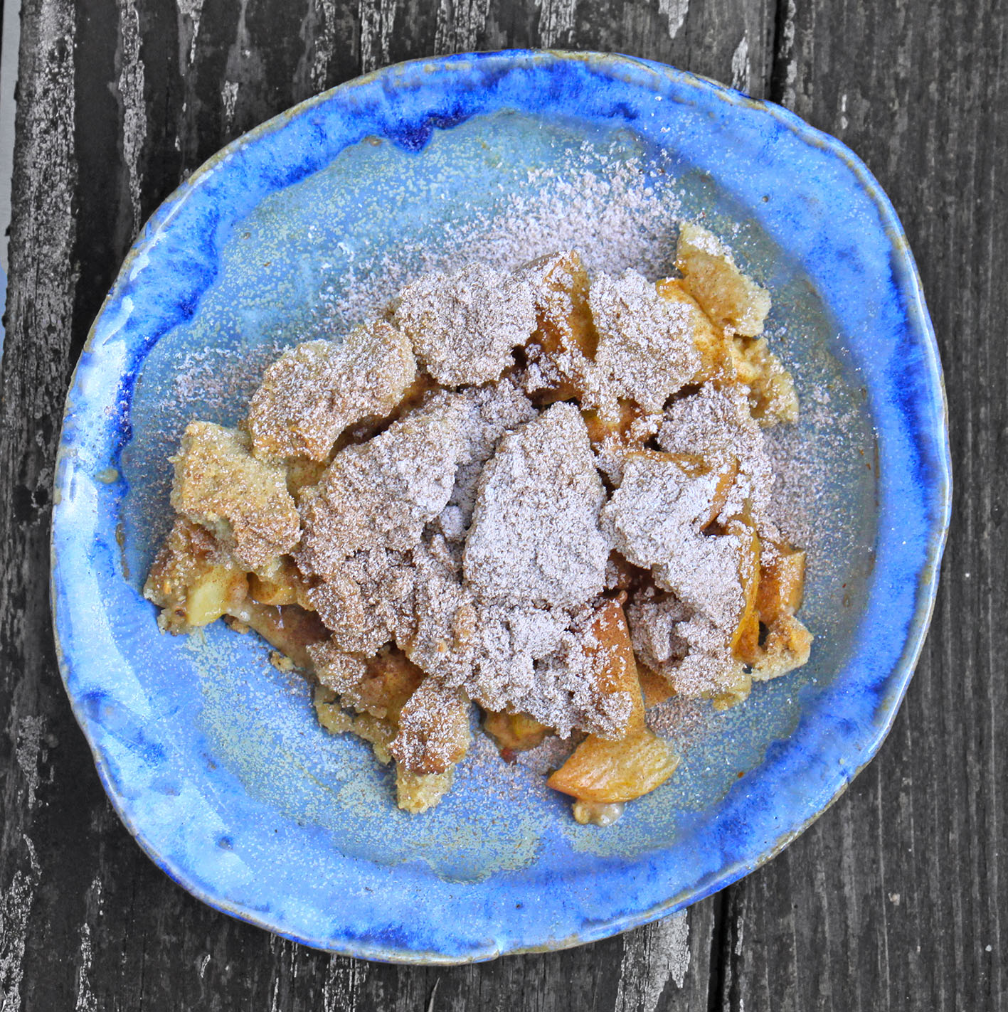 3 säuerliche Äpfel (ca. 700g) würfeln und mit 3EL braunem Zucker, 1 TL Zimt, 1 Prise Nelke, 1 TL Zitronenabrieb und einem Schuss Rum-Aroma mischen. In eine ofenfeste Form mit ca. 25cm ø geben. und gleich in den Backofen schieben, diesen auf 170° Umluft stellen. Für die Streusel: 120g kalte Butter, 40g Puderzucker, 1 TL Vanille, eine Prise Salz, 160g Mehl und 60g gemahlene (geschälte) Mandeln mit Knethaken verkneten und mit den Händen zu dicken Streuseln drücken. Nach ca. 15 Minuten den Form herausnehmen, die Streusel auf den Äpfeln verteilen und im jetzt voll aufgeheizten Backofen ca. 12 Minuten backen.