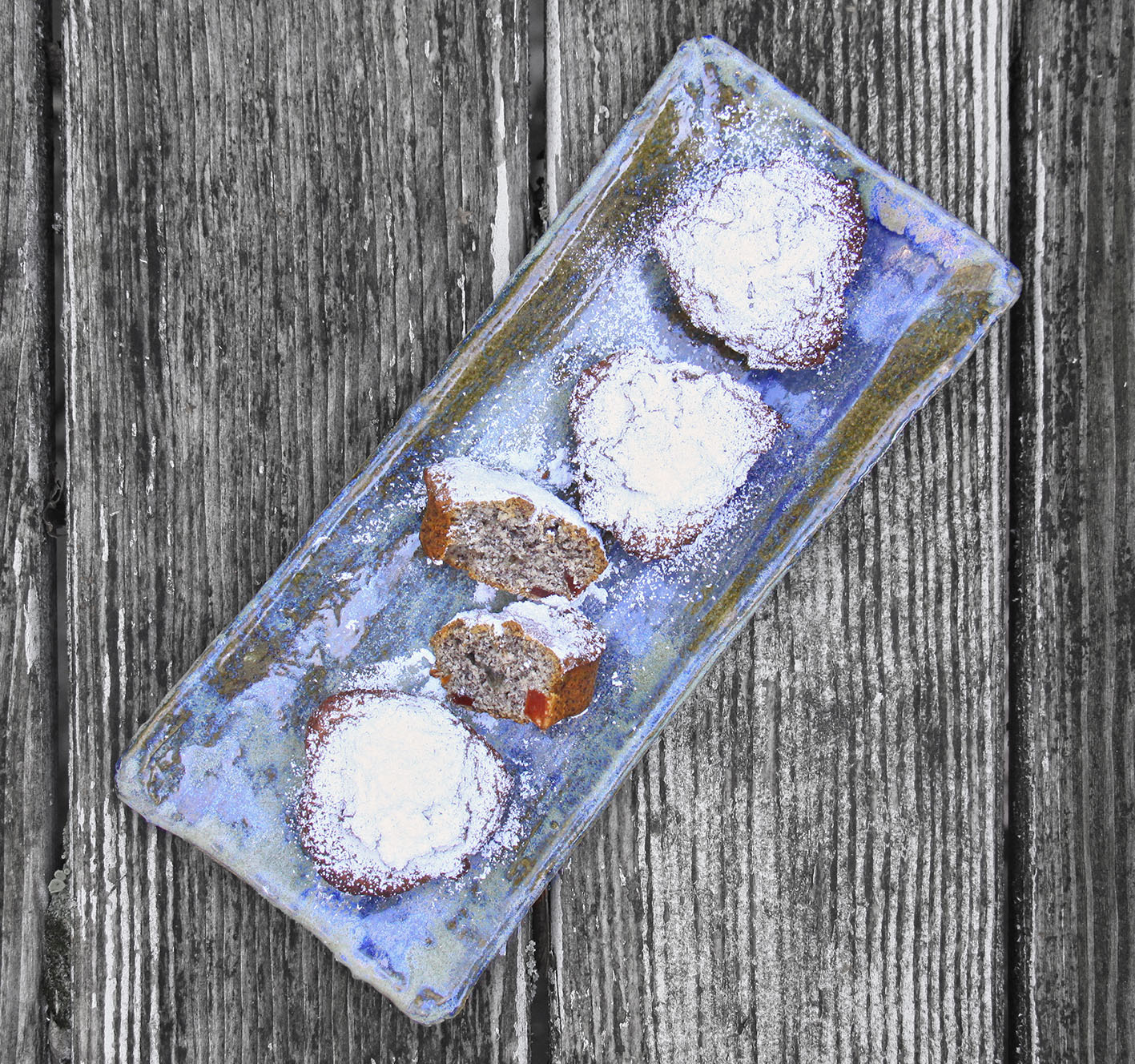 In einem mit Butter ausgepinseltem 12er Muffinblech (z.B. Sternform von Le Creuset – Teig reicht für 2 Bleche) verteilen und bei 160° im heissen Ofen ca. 35 Minuten backen. Noch warm mit Pudezucker bestreuen.