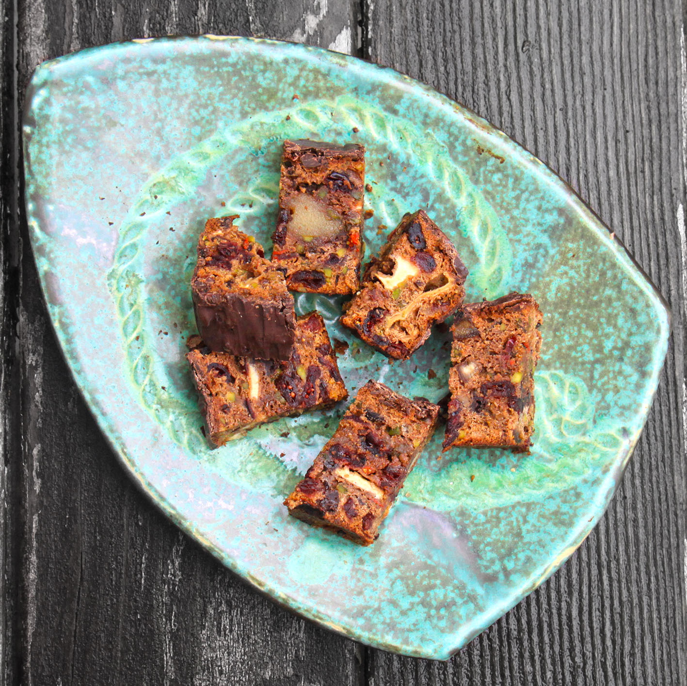 gewürfelt sowie 200 gehackte Nüsse dazugeben. Mit Kakao, Nelke, Kardamom und Zimt würzen. Die eingelegten Früchte mit der Masse mischen und alles für 40 Minuten bei 180° in einer flachen
