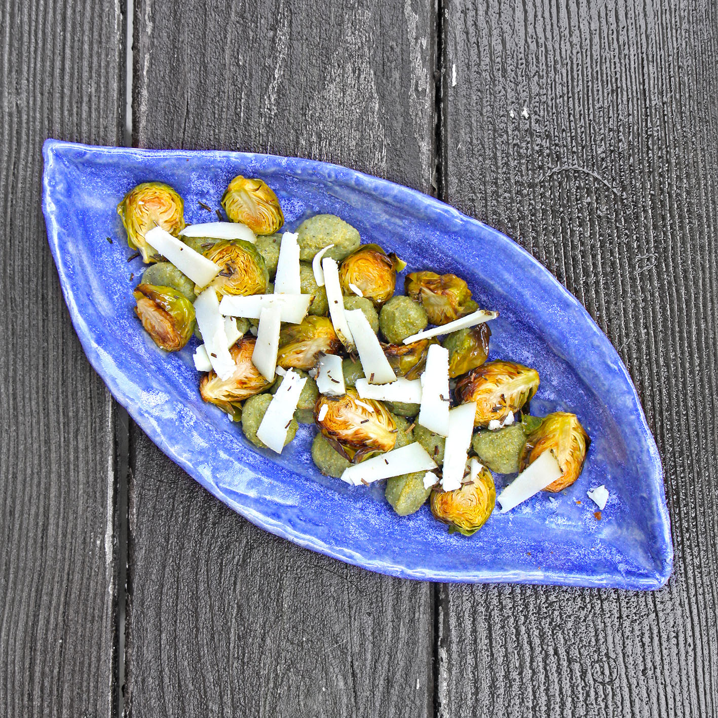 Für 2 Hungerige: 400g mehlig kochende Kartoffeln ungeschält in Salzwasser ca. 20 Minuten kochen, bis sie gar sind (mit einer Gabel testen). Abgießen, kurz ausdampfen lassen – dann gleich pellen und durch eine Kartoffelpresse in eine Rührschüssel pressen. 100g frischen Spinat in ein Sieb geben. Ca. 1 Liter Wasser zum Kochen bringen, das kochende Wasser über den Spinat gießen, so daß dieser langsam zerfällt. Dann gut ausdrücken und ganz fein hacken. Kartoffeln und Spinat auskühlen lassen. 150g Mehl (Type 405) mit 1 TL Salz und etwas Pfeffer vermengen, dann mit dem Spinat zu den Kartoffeln geben alles zu einem glatten Teig verkneten. Die Gnocchi-Masse in 3 Teilen auf leicht bemehlter Unterlage zu ca. fingerdicken Strängen rollen. Dann in 1 cm große Stücke schneiden. Von 400g Rosenkohl die Röschen halbieren, auf einem Blech ausbreiten, mit 2EL Olivenöll und Zitronensaft beträufeln und im Backofen mit Grill oder Oberhitze bei 200° bräunen. In diese Zeit die Gnocchi kochen. Einen Topf mit Salzwasser zum Kochen bringen, die Gnocchi dann portionsweise so lange darin garen, bis sie an die Oberfläche kommen. Den gegrillten Rosenkohl mit dem Öl-Zitrone-Gemisch über die Gnocchi geben. Von einem kräftigen Hartkäse (z.B. Parmesan oder alter Manchego) dünne Späne schneiden und darüber streuen.